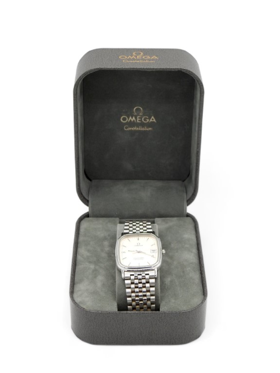 Refernza 1960267 - 3960970. Calibro 1430, cassa in acciaio logata, bracciale originale Omega, colore silver (rigato) con indici neri, sfere a bastone, corona in acciaio originale logata, vetro minerale di forma, fondo in acciaio logato esterno.