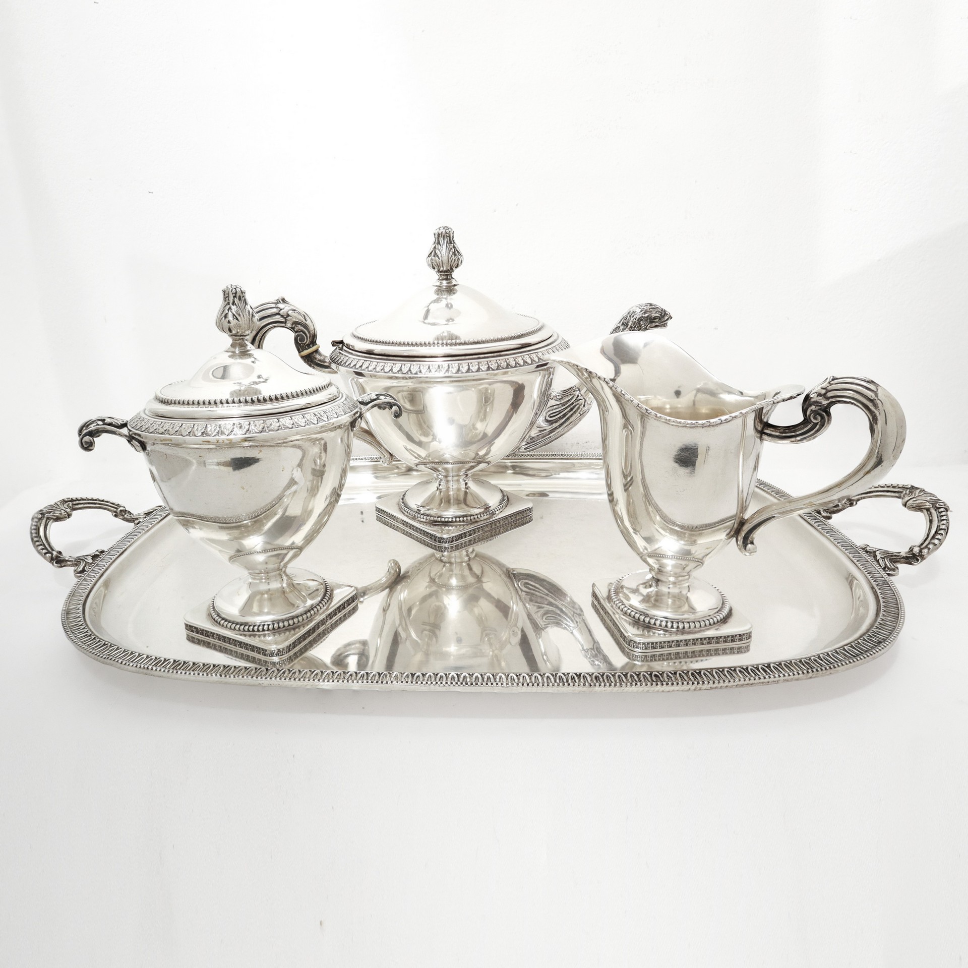 Servizio da caffè in argento 800 composto da caffettiera, lattiera, zuccheriera e vassoio con decorazione sui manici di pigne e volatile. gr. 2532 Punzone 800