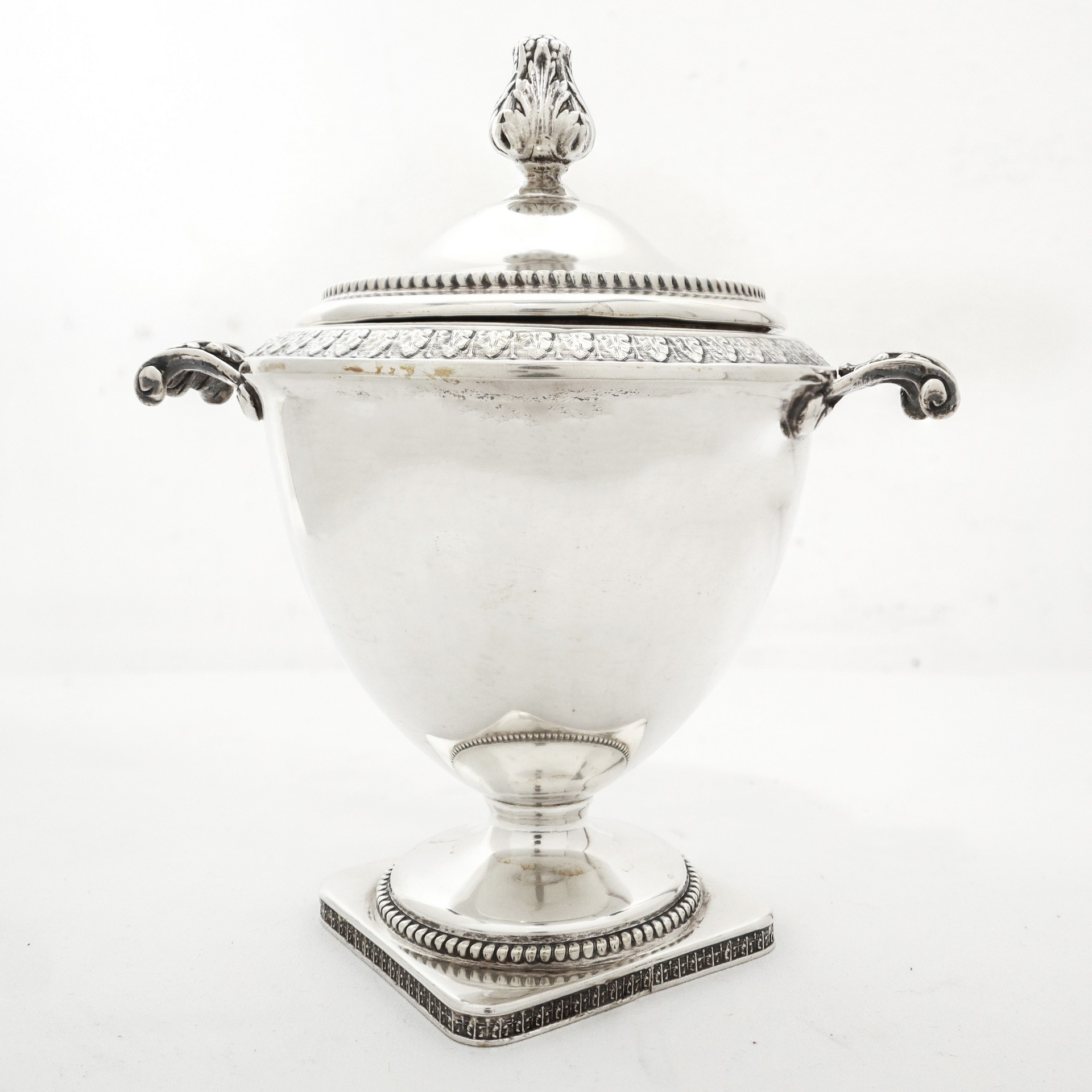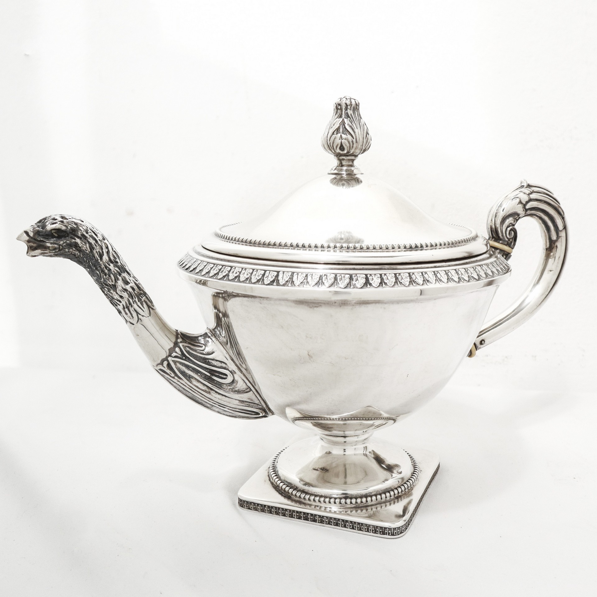 Servizio da caffè in argento 800 composto da caffettiera, lattiera, zuccheriera e vassoio con decorazione sui manici di pigne e volatile.