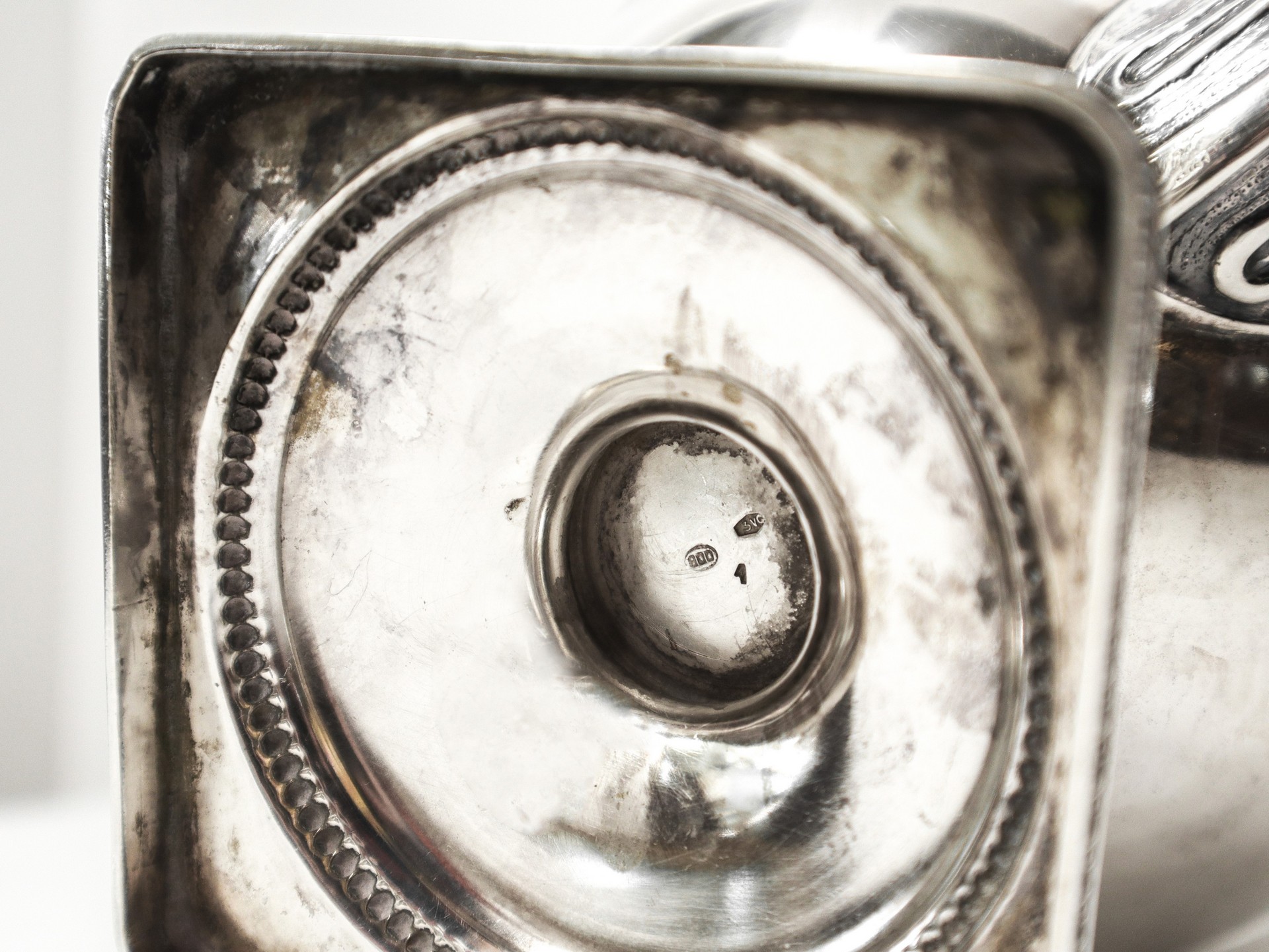Lotto 18 | Servizio da caffè in argento 800 composto da caffettiera, lattiera, zuccheriera e vassoio con decorazione sui manici di pigne e volatile.