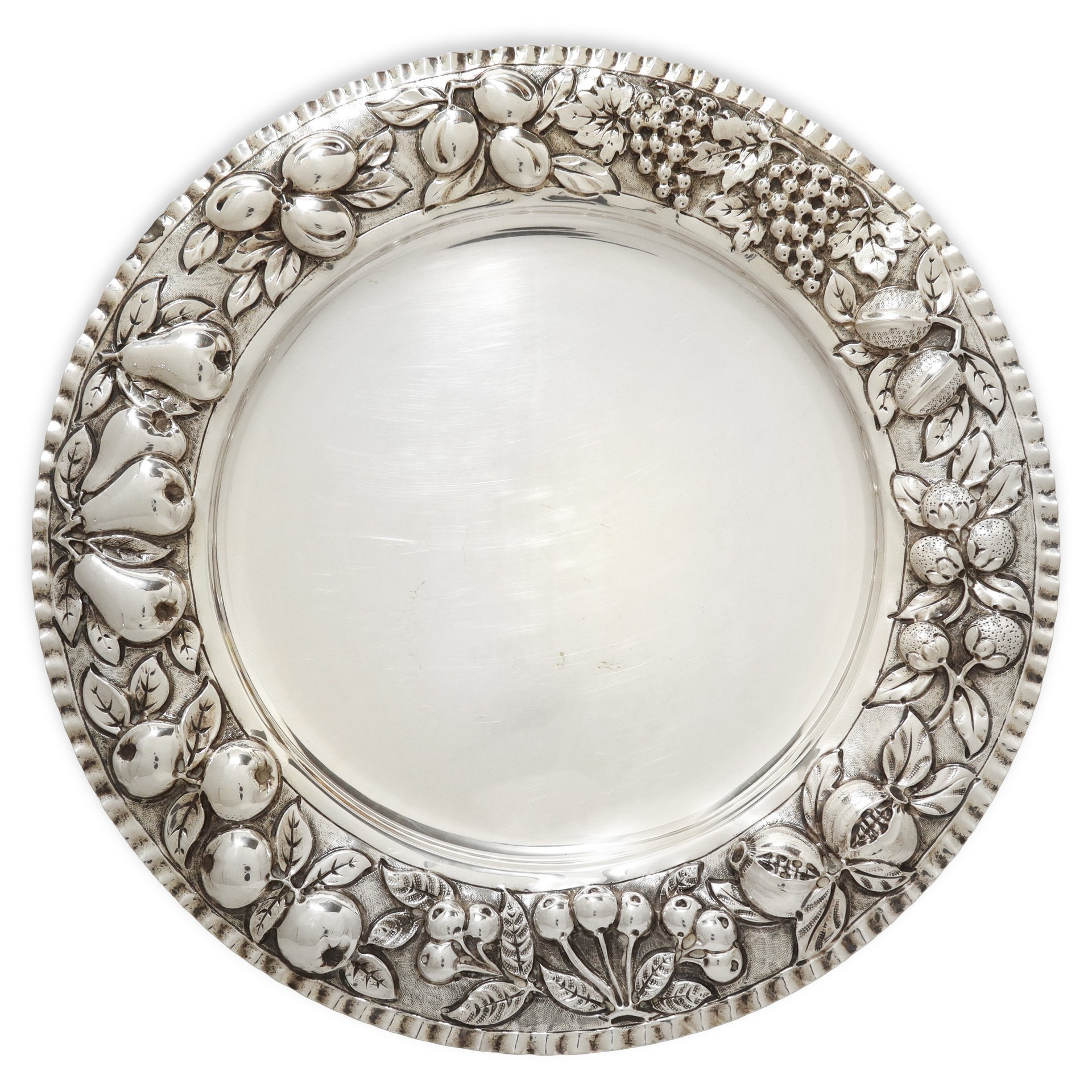 Piatto centrotavola in argento 800 con decorazioni a sbalzo di melagrane lungo il bordo lungo il bordo