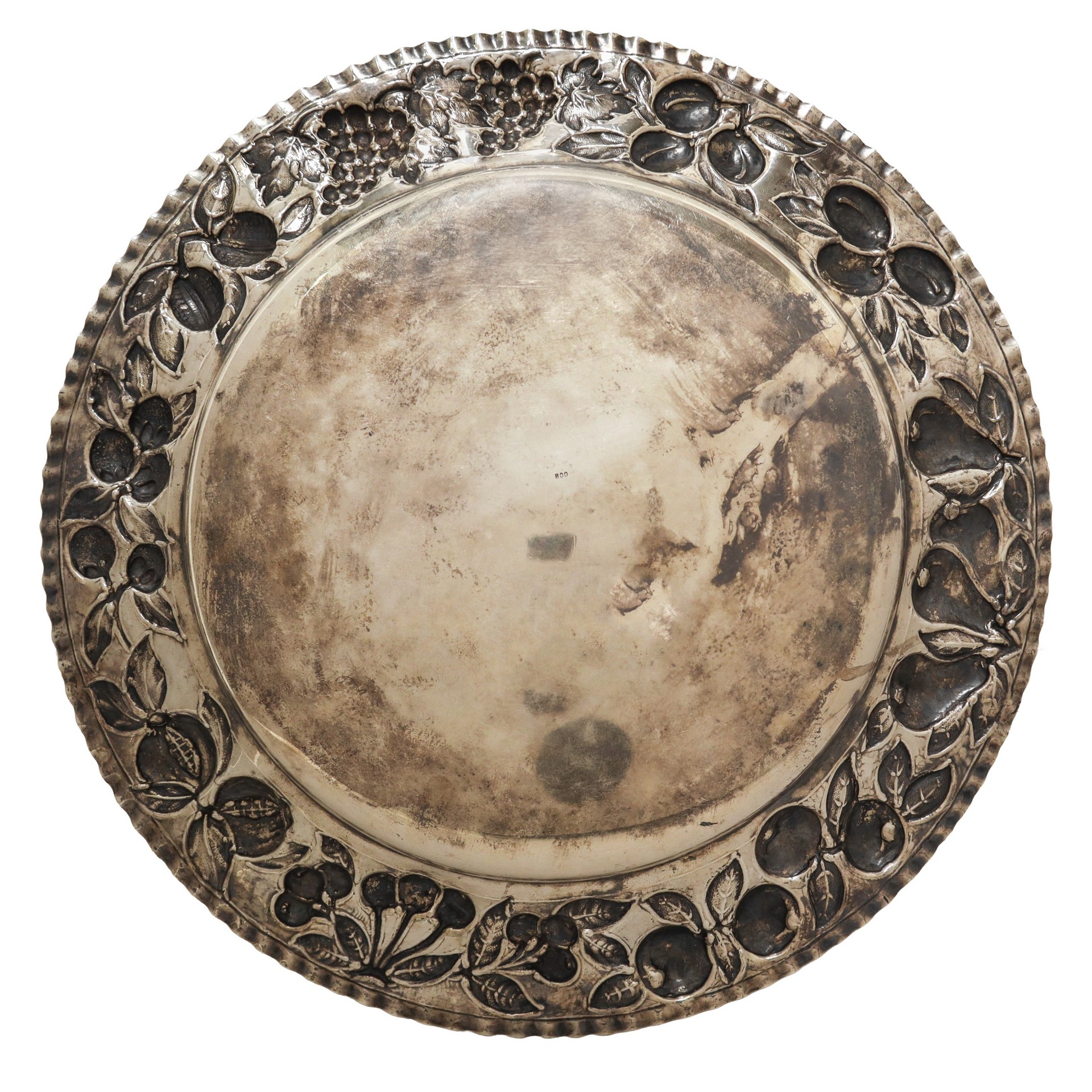 Piatto centrotavola in argento 800 con decorazioni a sbalzo di melagrane lungo il bordo lungo il bordo gr.766 Punzone 800