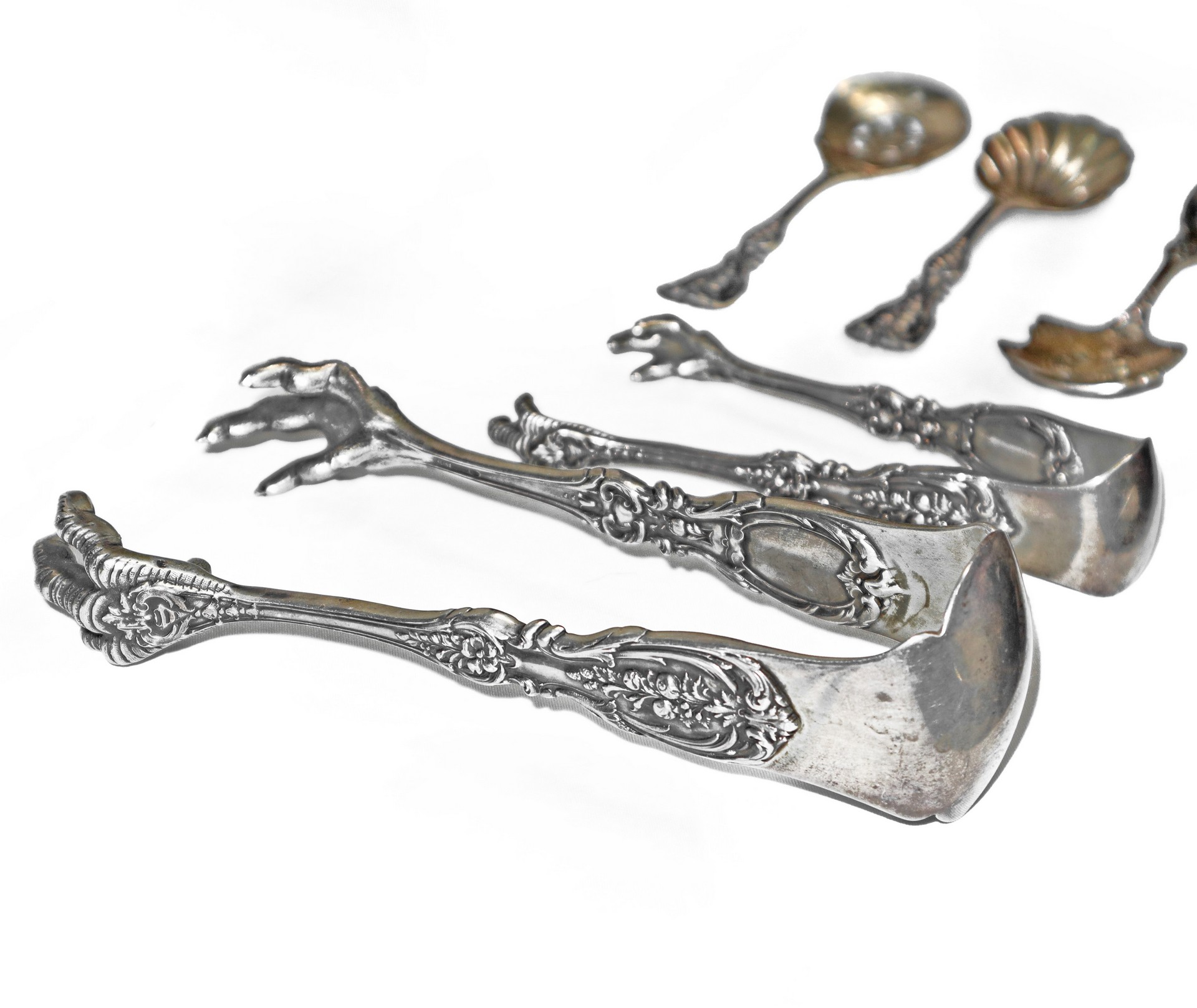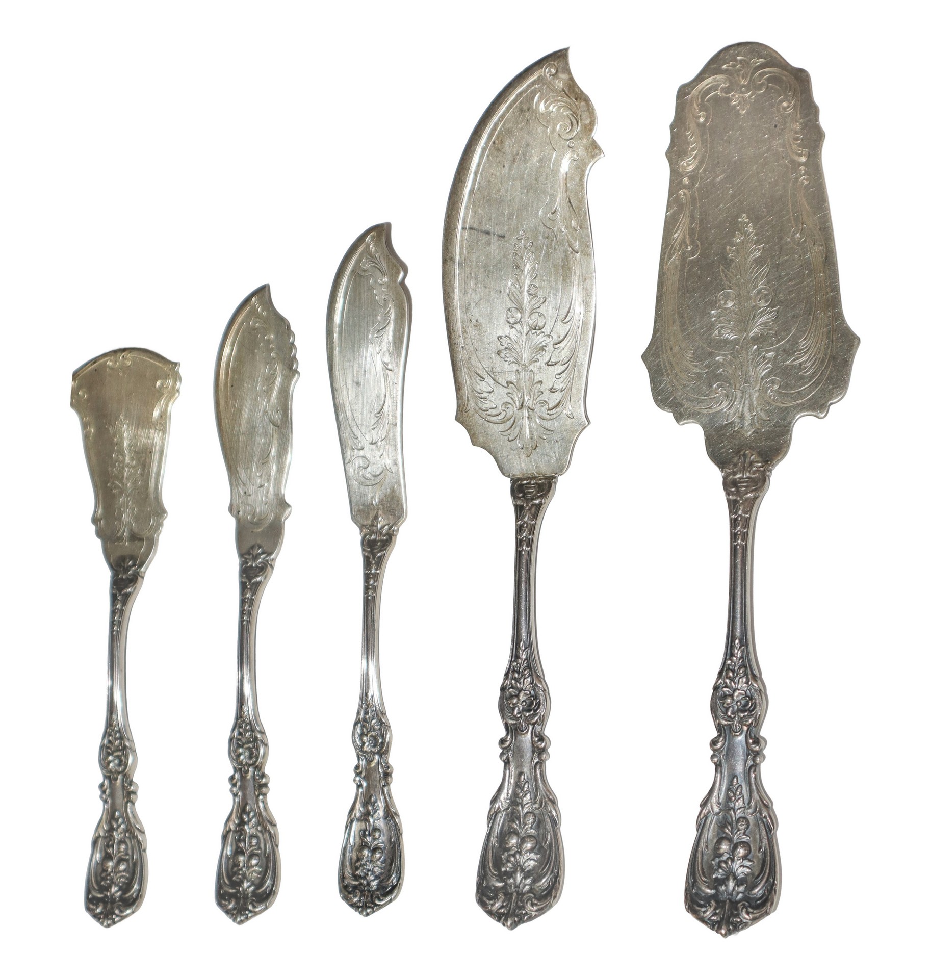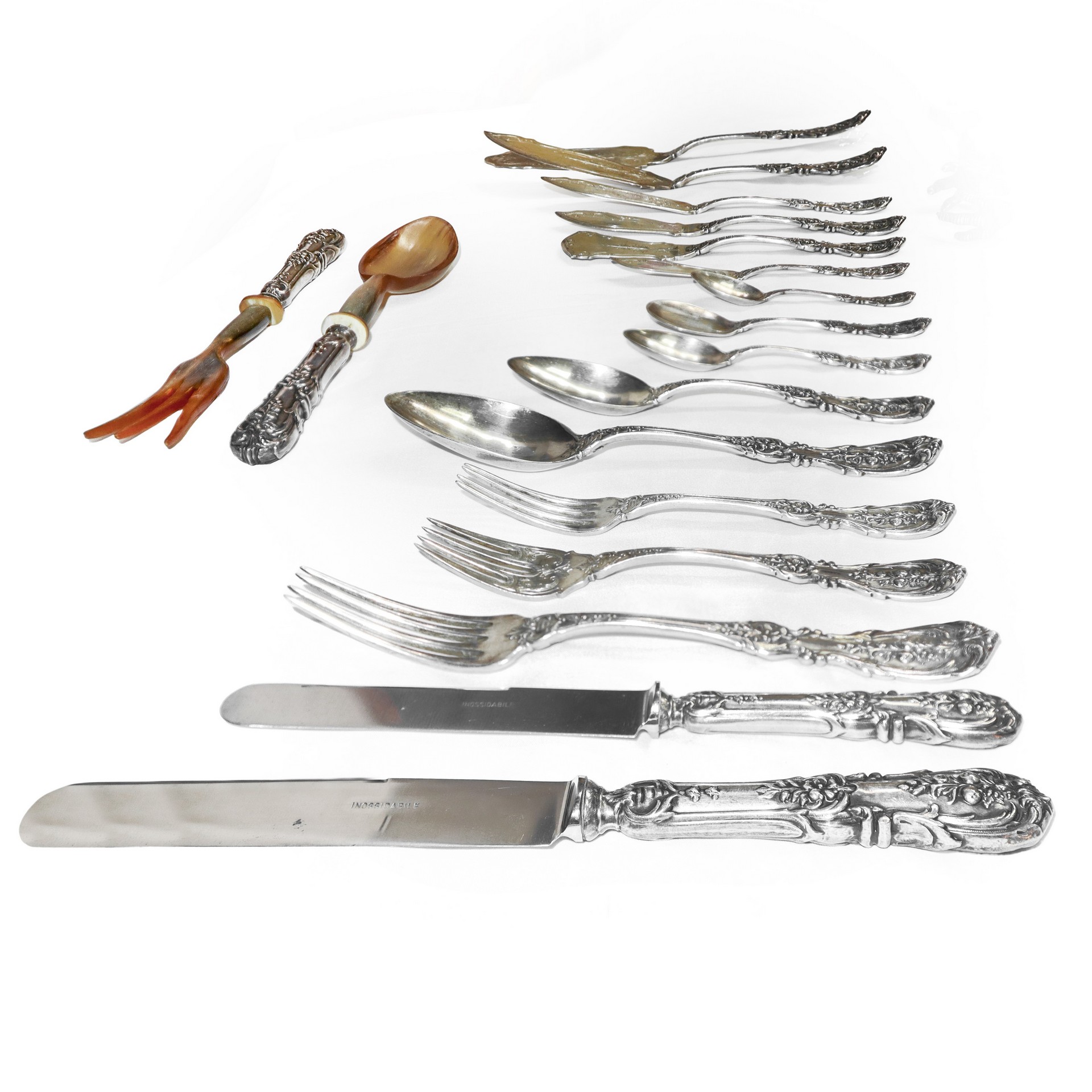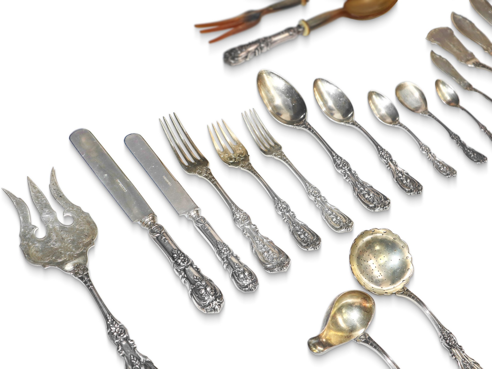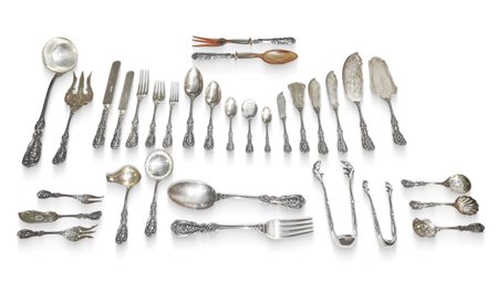 CESA Argentiere - Importante e completissimo Servizio di posate in argento da 12 modello " Quirinale", Manifattura CESA, con manico stile floreale a rilievo., Alexandria gr. 10.162 (esclusi i coltelli) Servizio composto da: 12 forchette (766 gr), 12 forchettine dolce (gr 384), 12 cucchiaini (224 gr.), 24 forchette grandi (2294 gr), 12 cucchiai (1168 gr.), 12 forchette frutta (738 gr.), 12 cucchiaini dolce (714 gr.), 10 cucchiaini da te (332 gr.), 17 posate da portata (1986 gr), 12 coltelli pesce (828 gr.), 12 cucchiaini gelato (366 gr.), 12 coltelli piccoli (362 gr.) 2 posate da insalata (168 gr), coltelli (3584 gr.)