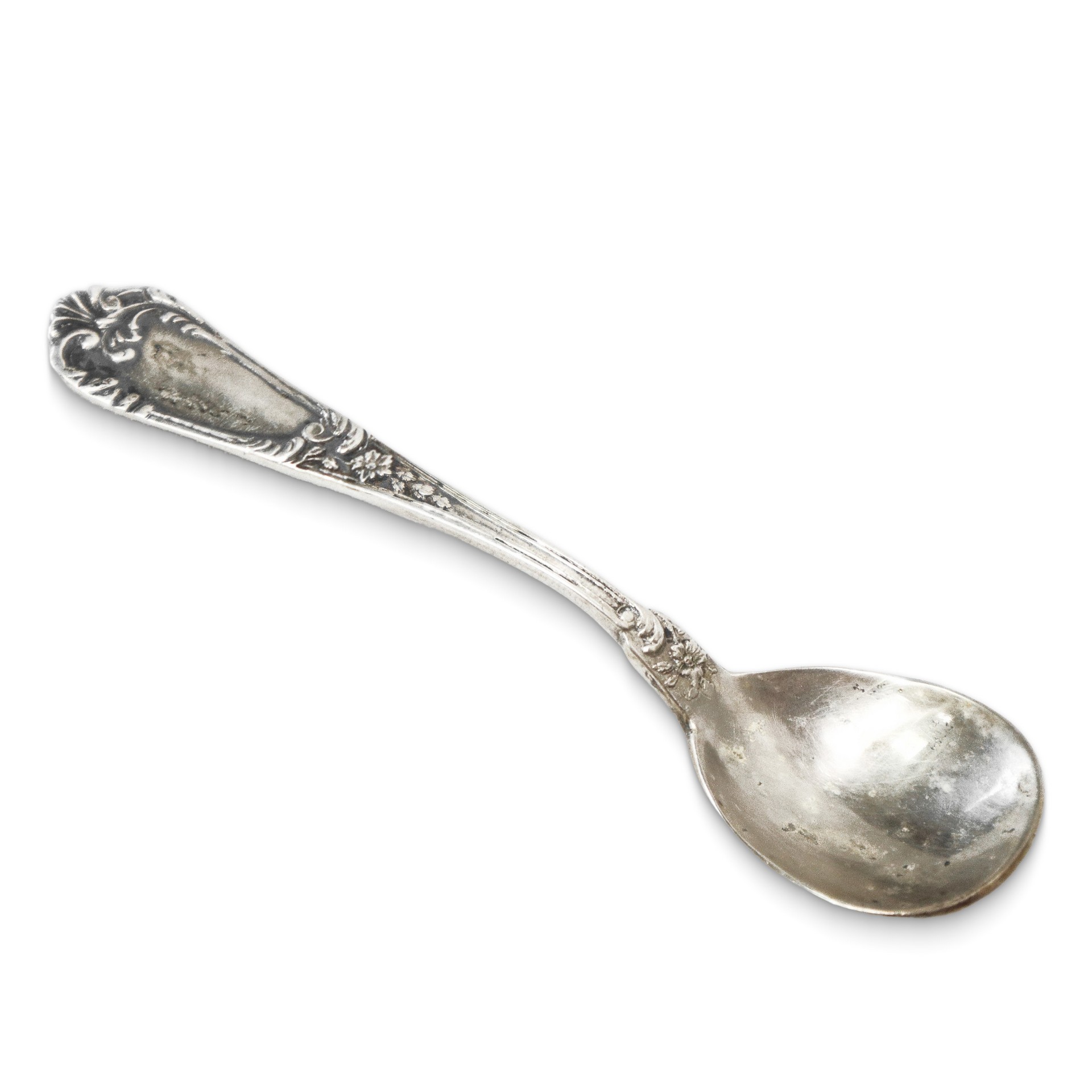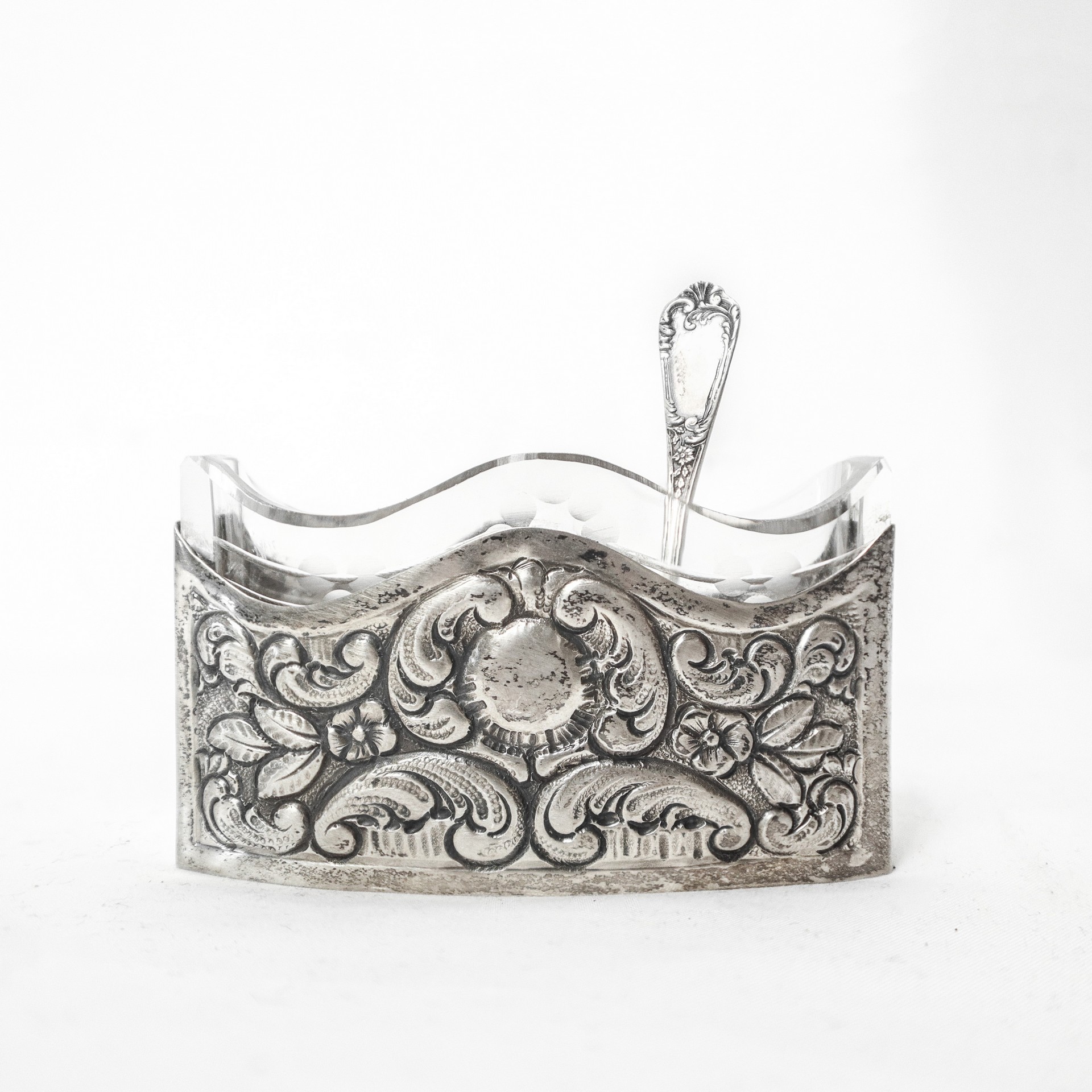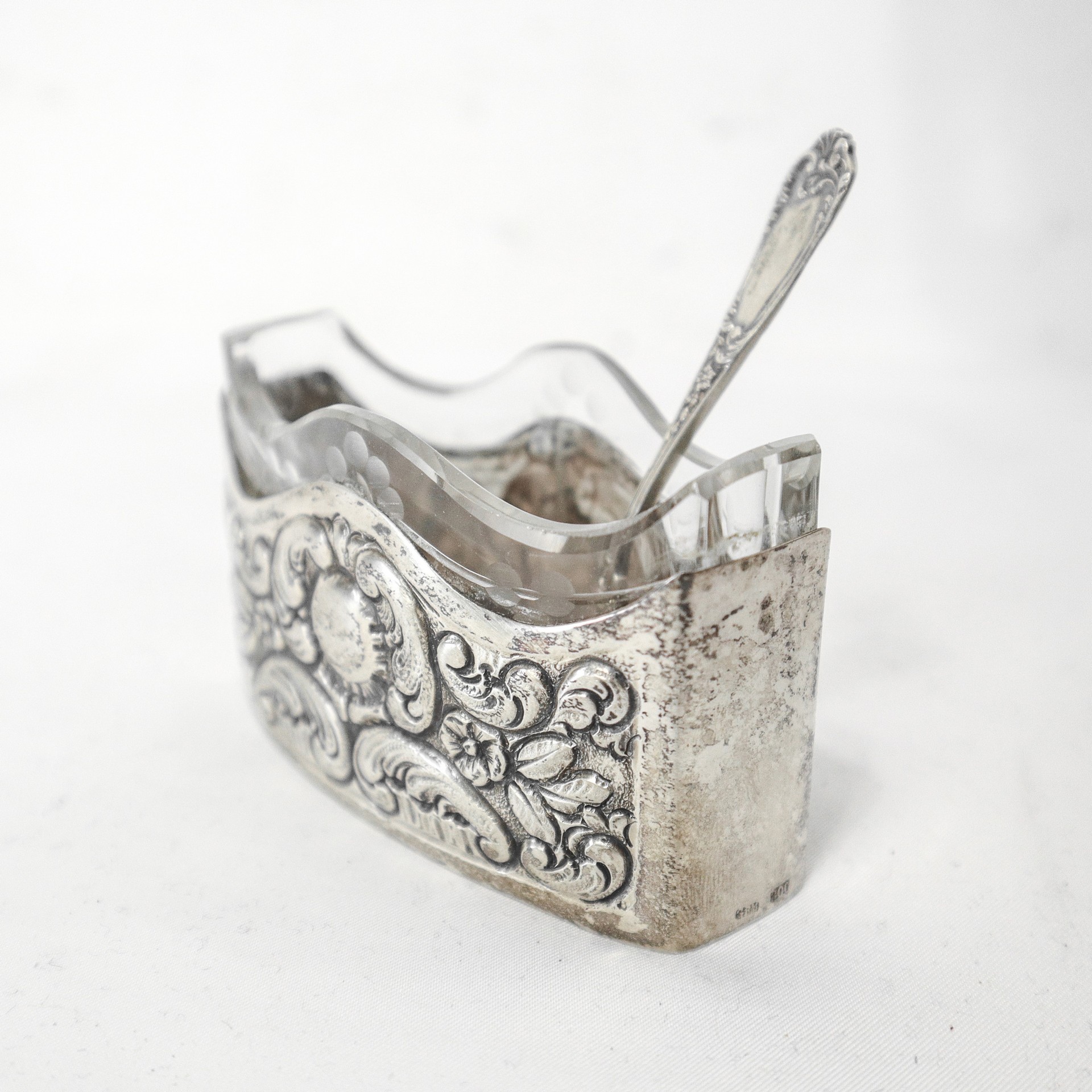 Ciotoline in vetro sale e pepe con base in argento 800 decorate a sbalzo a motivi floreali gr. 92 (totali) h cm 5X9 (cadauna) Punzone 800. Una delle due dotata di cucchiaino in argento 800 punzonato