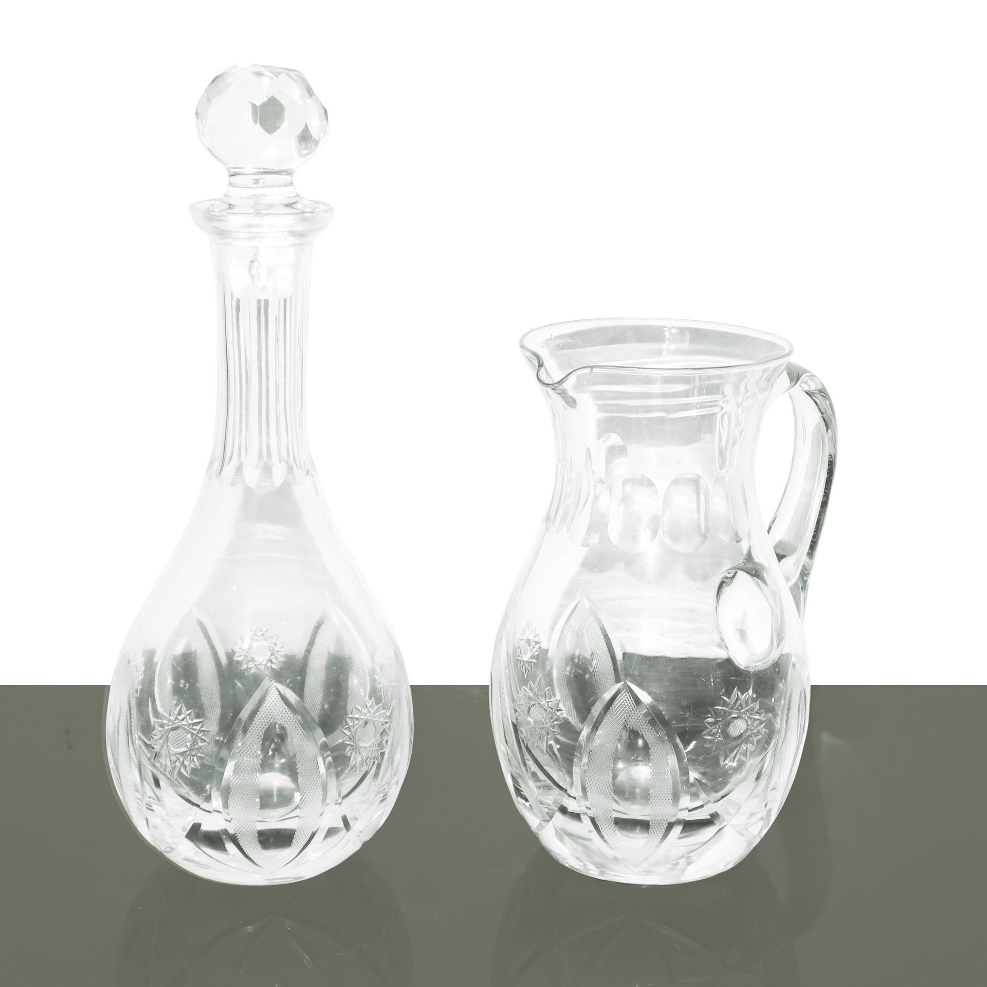 Brocca e bottiglia in cristallo molato e intagliato bottiglia: h cm 32 brocca h cm 21