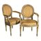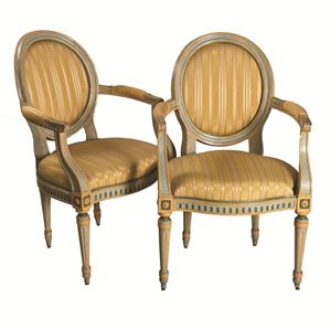 COPPIA DI POLTRONE Coppia di poltrone laccate in oro e azzurro rivestite con tessuto color oro, Francia epoca Luigi XVI H 37 cm