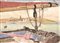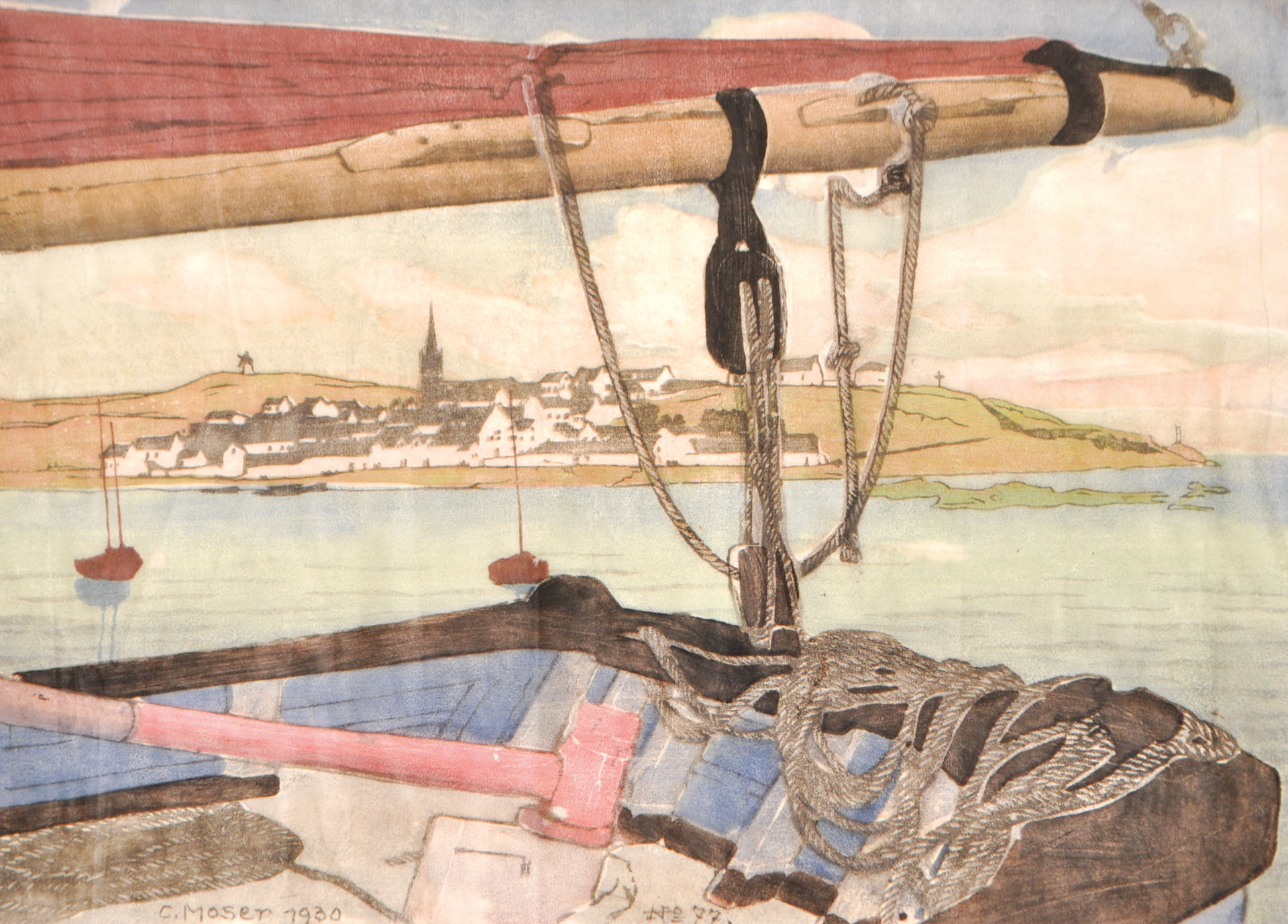 Carl Moser (Bozen/Bolzano 1873 - 1939) Villaggio bretone visto da una nave, 1930;Xilografia a colori, 34,5 x 48,5 cm, in cornice