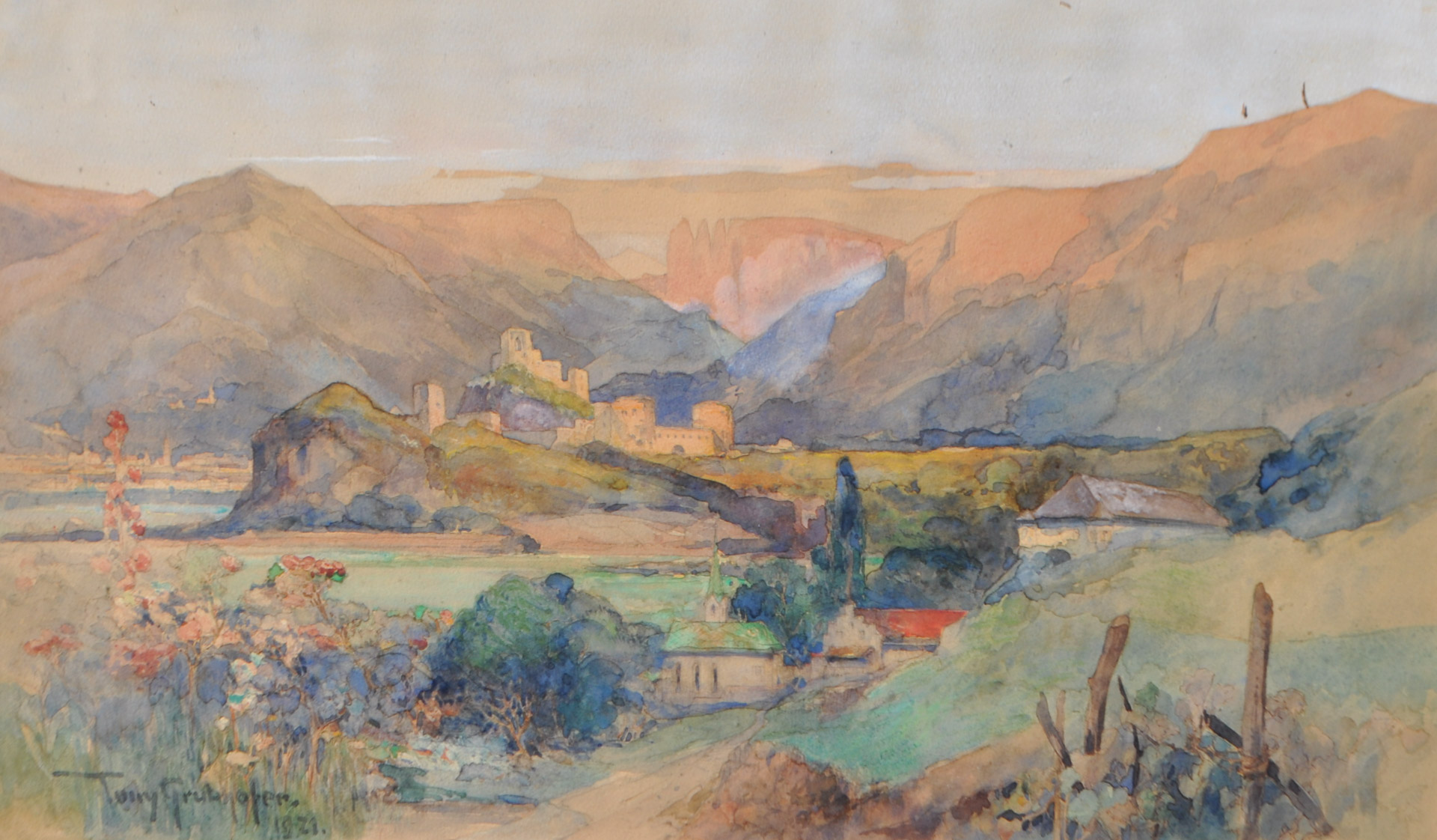 Tony Grubhofer (Innsbruck 1854 - 1935) Castel Firmiano con vista sullo Sciliar, 1921;Acquerello, matita, 32 x 55,5 cm, in cornice