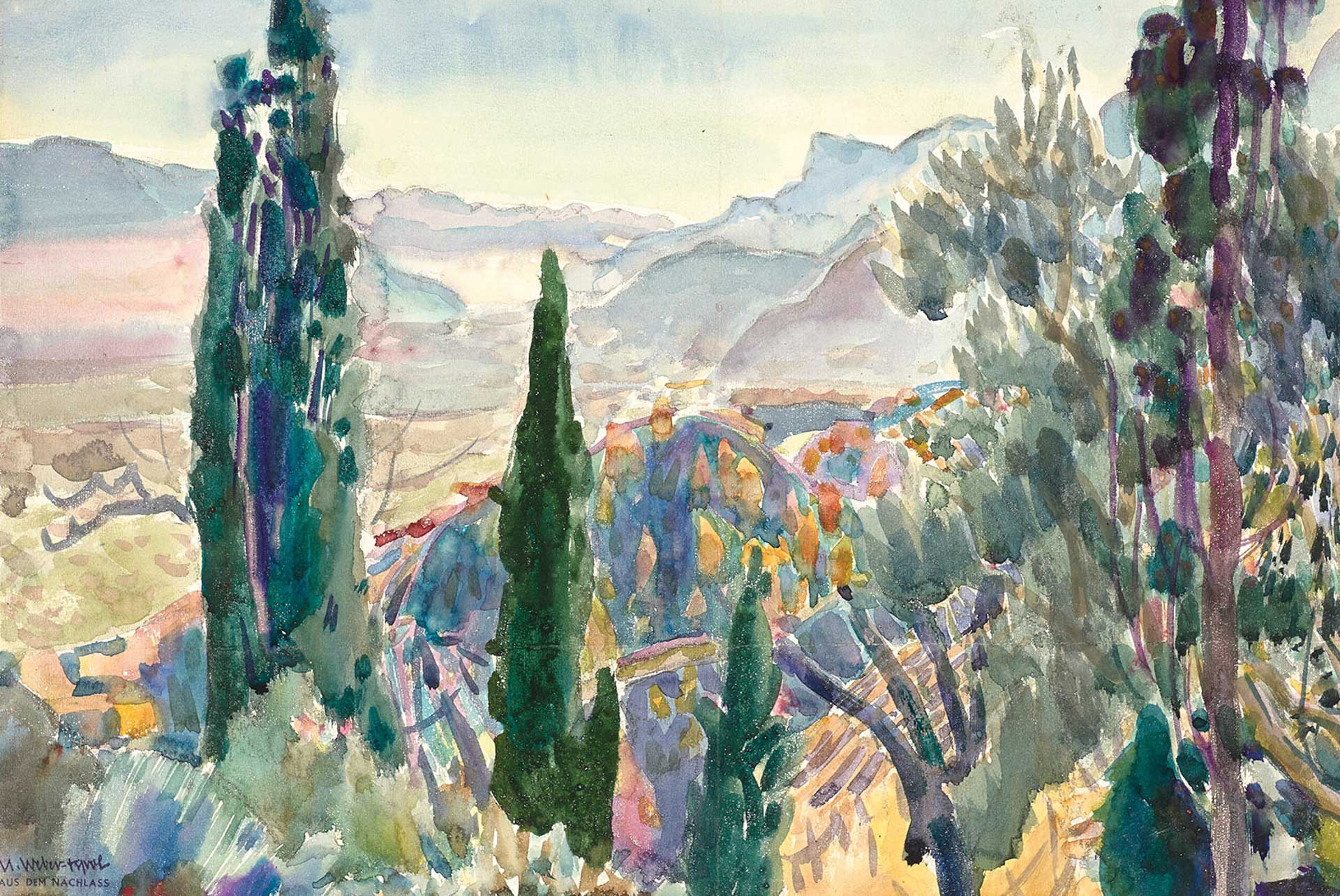 Hans Josef Weber-Tyrol (Schwaz 1874 - Meran/Merano 1957) Val d’Adige con Mendola;Guazzo, 32 x 48 cm, in cornice
