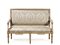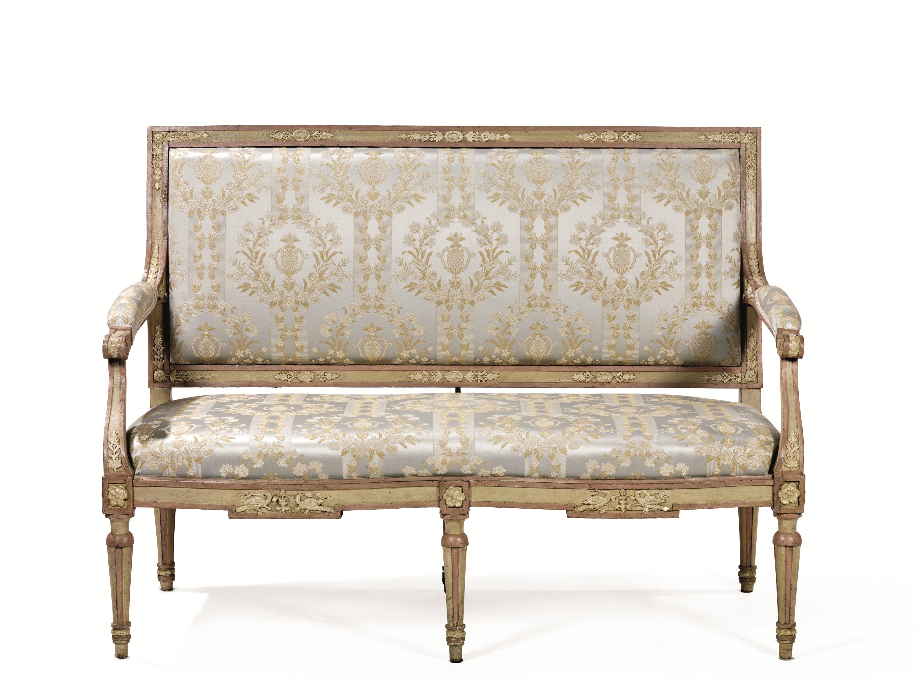 in legno intagliato, dipinto nei toni dellavorio e del rosa antico e decorato a pastiglia a motivi fitomorfi e colombe, spalliera rettilinea, braccioli a giorno con estremità a ricciolo su sostegni mossi, fascia mossa, gambe tornite e scannellate su piedi a ghianda, ricoperto in seta operata grigia,lungh. cm 135, restauri