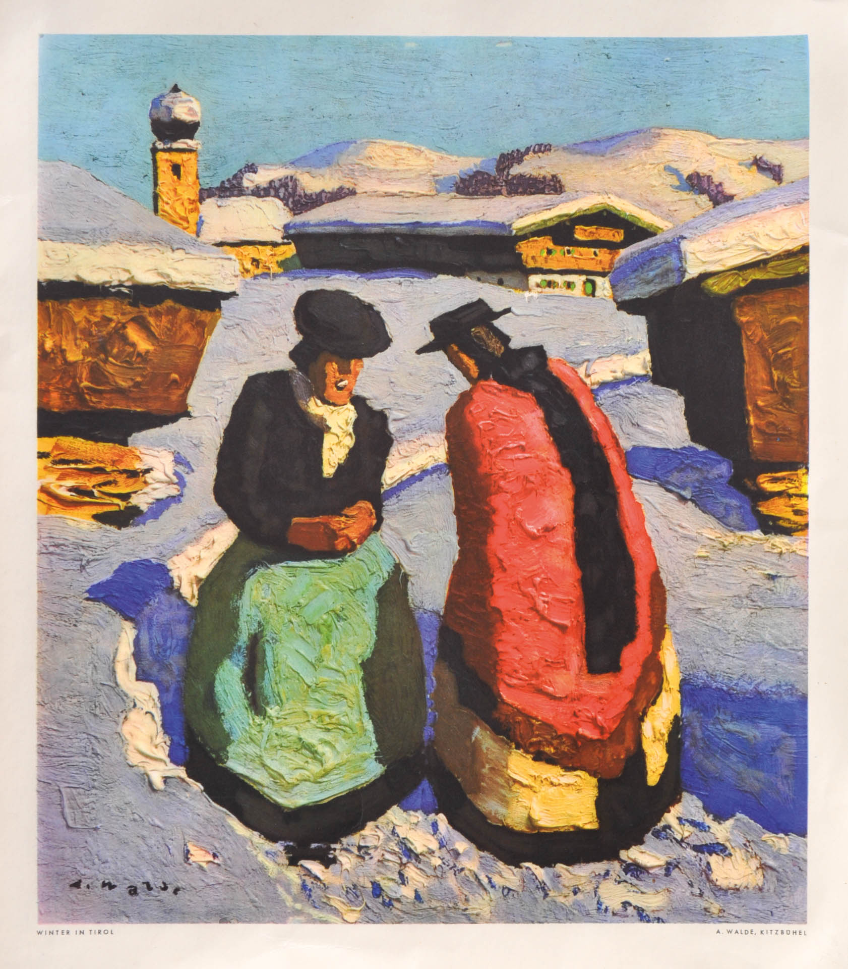 Alfons Walde Inverno in Tirolo, 1940 ca.;Stampa offset, 38,5 x 33,8 cm Scritta