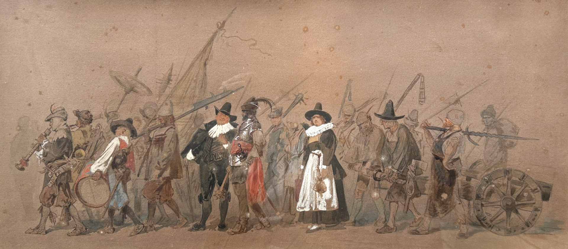 Carl Goebel Scena della Guerra dei Trent’anni;Guazzo, matita, 26 x 58 cm, macchie, brunito