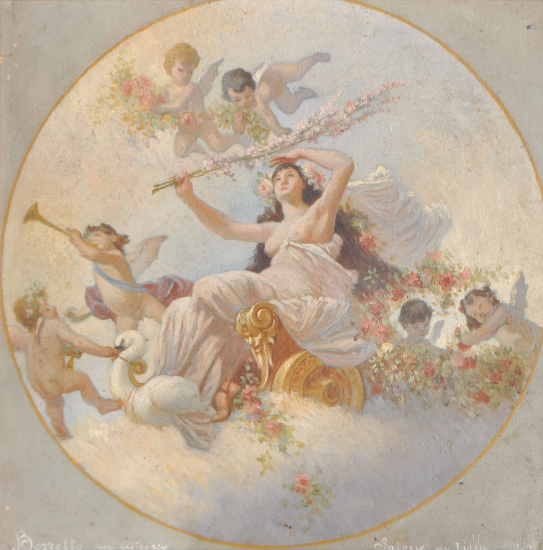 Trentiner Maler des frühen 20. Jh./Pittore trentino del primo Novecento Leda col cigno - Bozzetto per affresco salone di Villa, 1920;Olio su cartone, 33,5 x 34 cm, in cornice