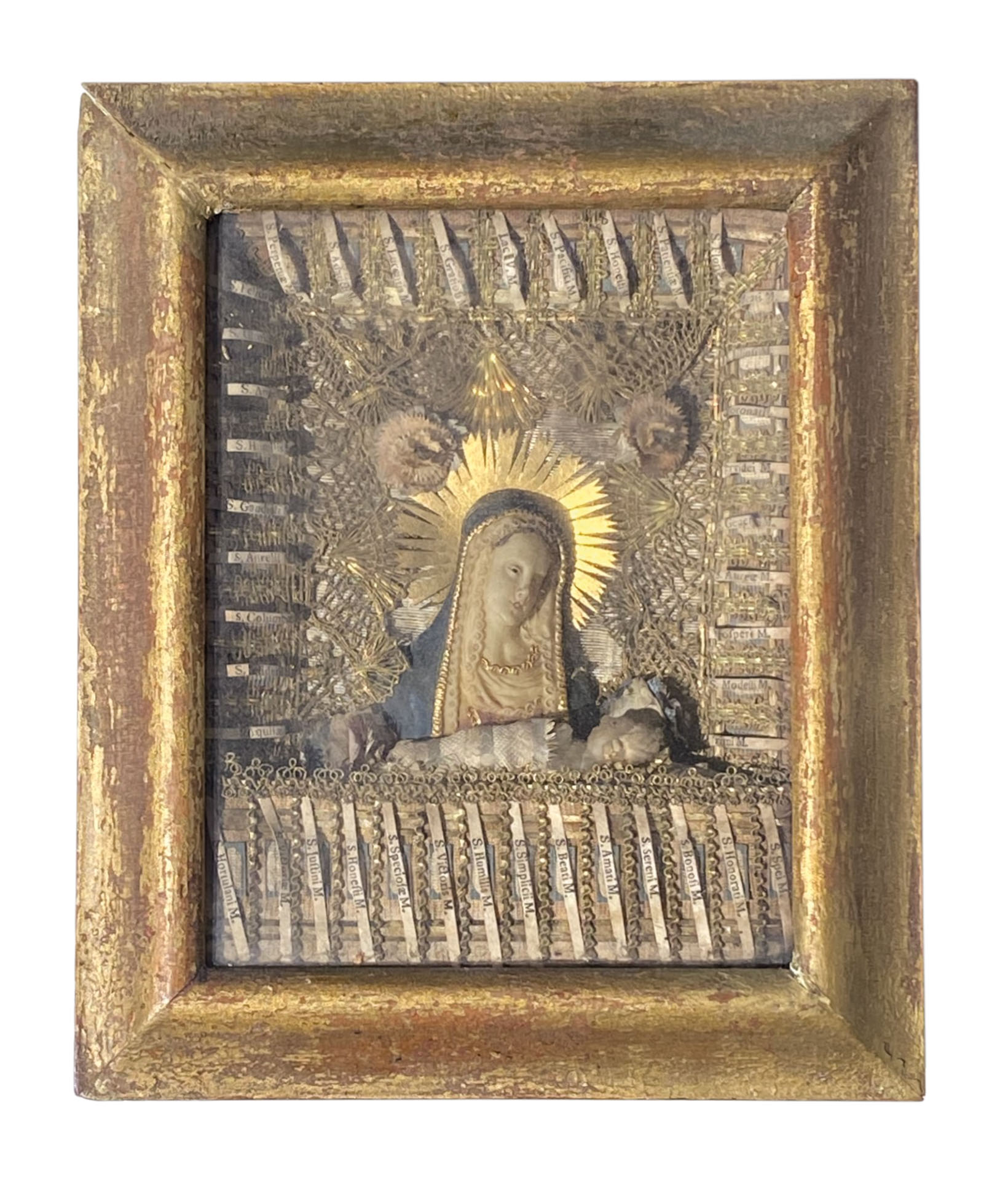 Anonym/Anonimo Lavoro monastico "Madonna con Bambino", prima metà del XIX secolo;Cera, reliquie, materiali vari, in cornice,