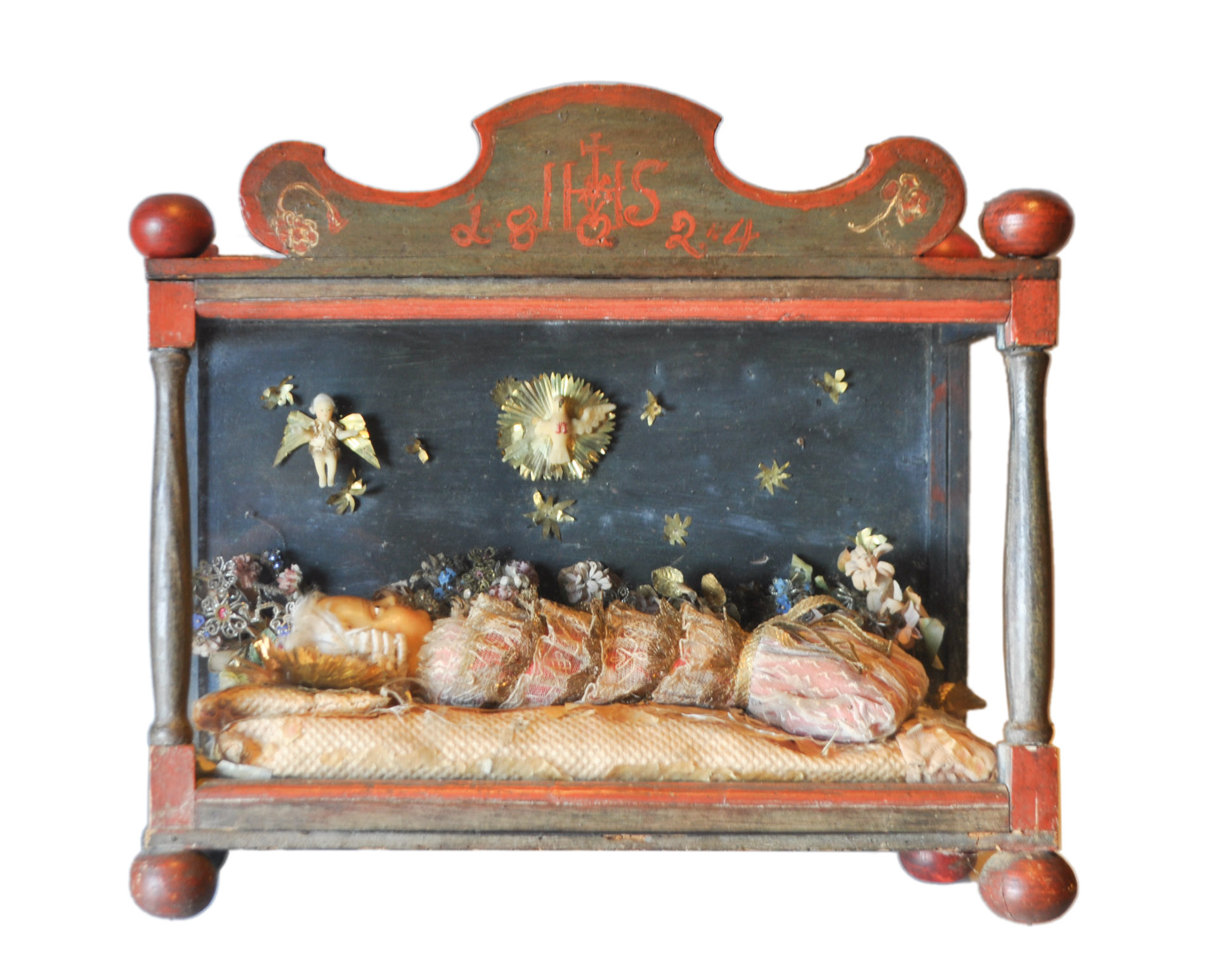 Regione alpina/Alpenländisch Opera monastica "Jesuskindl", 1824;Cera, materiali vari, vetrina in legno dipinto, 50 x 56 x 22
