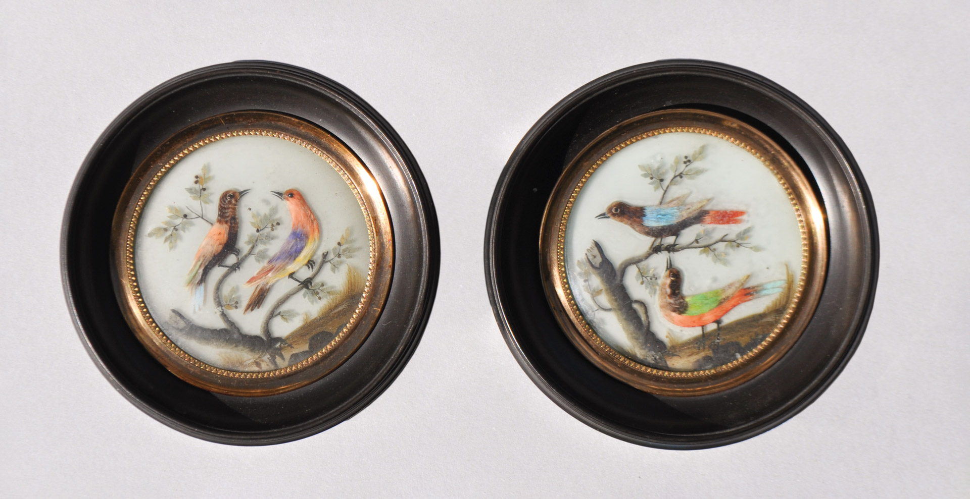 Anonym/Anonimo Due coppie di uccelli, XIX secolo;Guazzo e collage con piume di uccello su vetro, diametro 8 cm