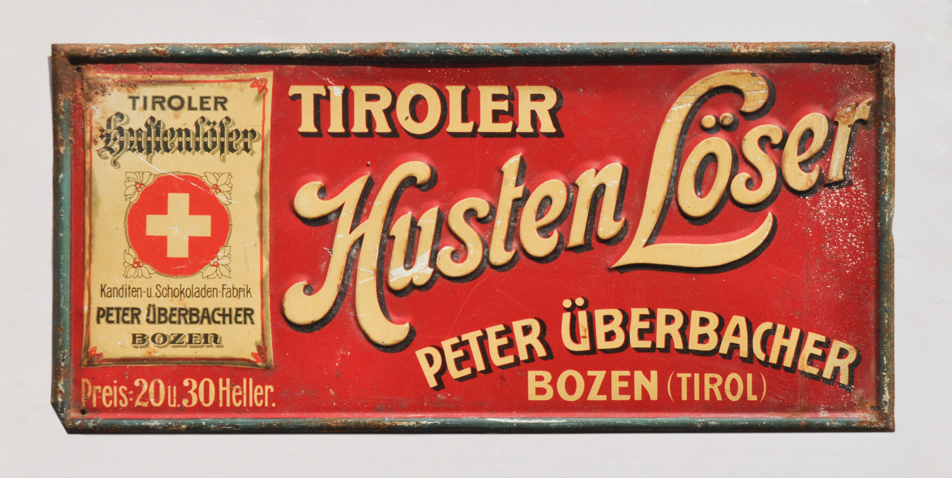 Anonym/Anonimo Insegna pubblicitaria "Tiroler Hustenlöser Peter Überbacher Bozen", 1915 ca.;Metallo, 16 x 34,5 cm, danni dovuti all’età