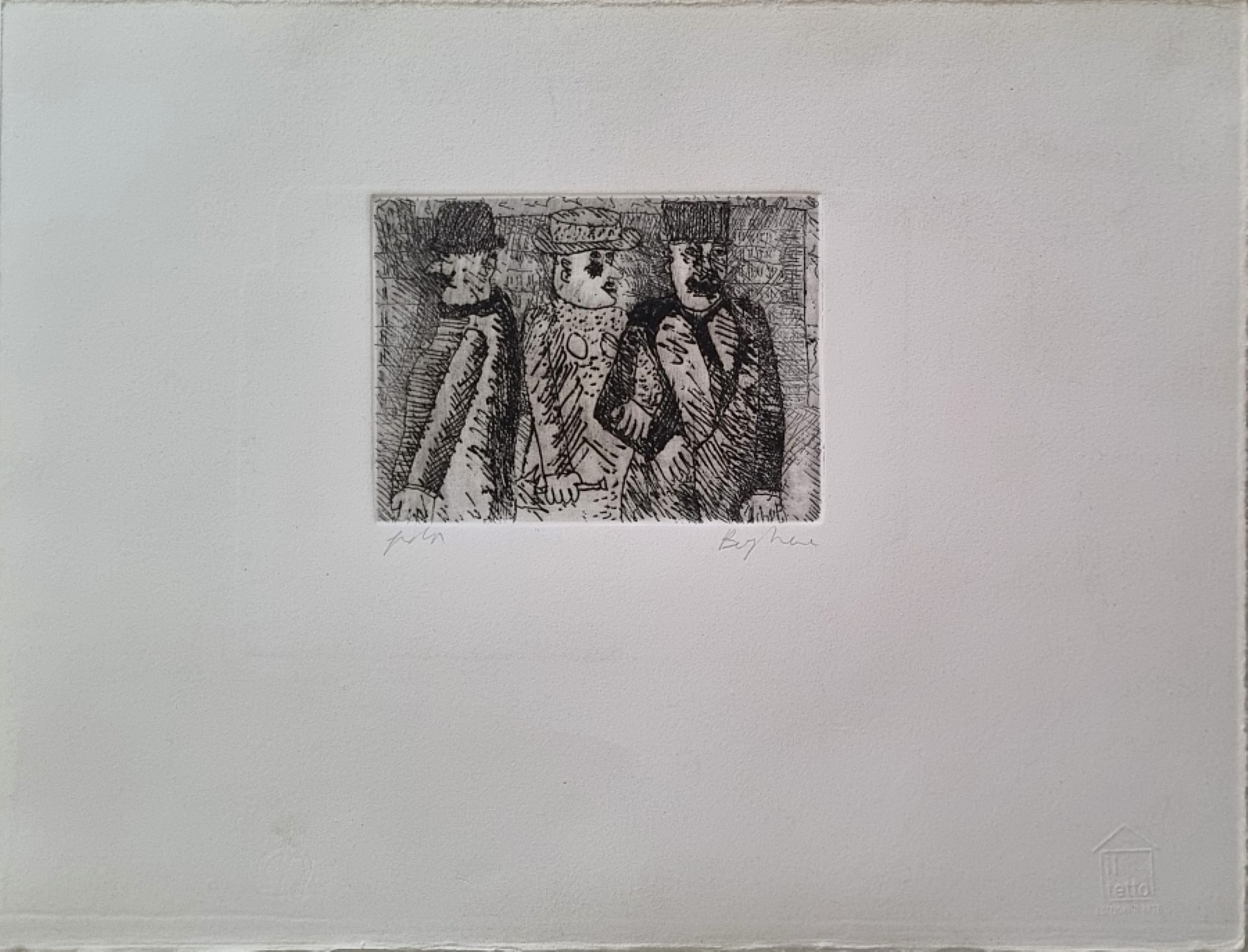 BORGHESE FRANZ Roma 1941 - 2005 "Senza titolo" Incisione su cartoncino cm 33,3x25,5 (foglio), cm 11,7x8,5 (disegno). Firma e timbro a secco "Il Tetto Grafiche d'arte" a destra, tiratura p.d.a. a sinistra. Provenienza Studio Borghese.