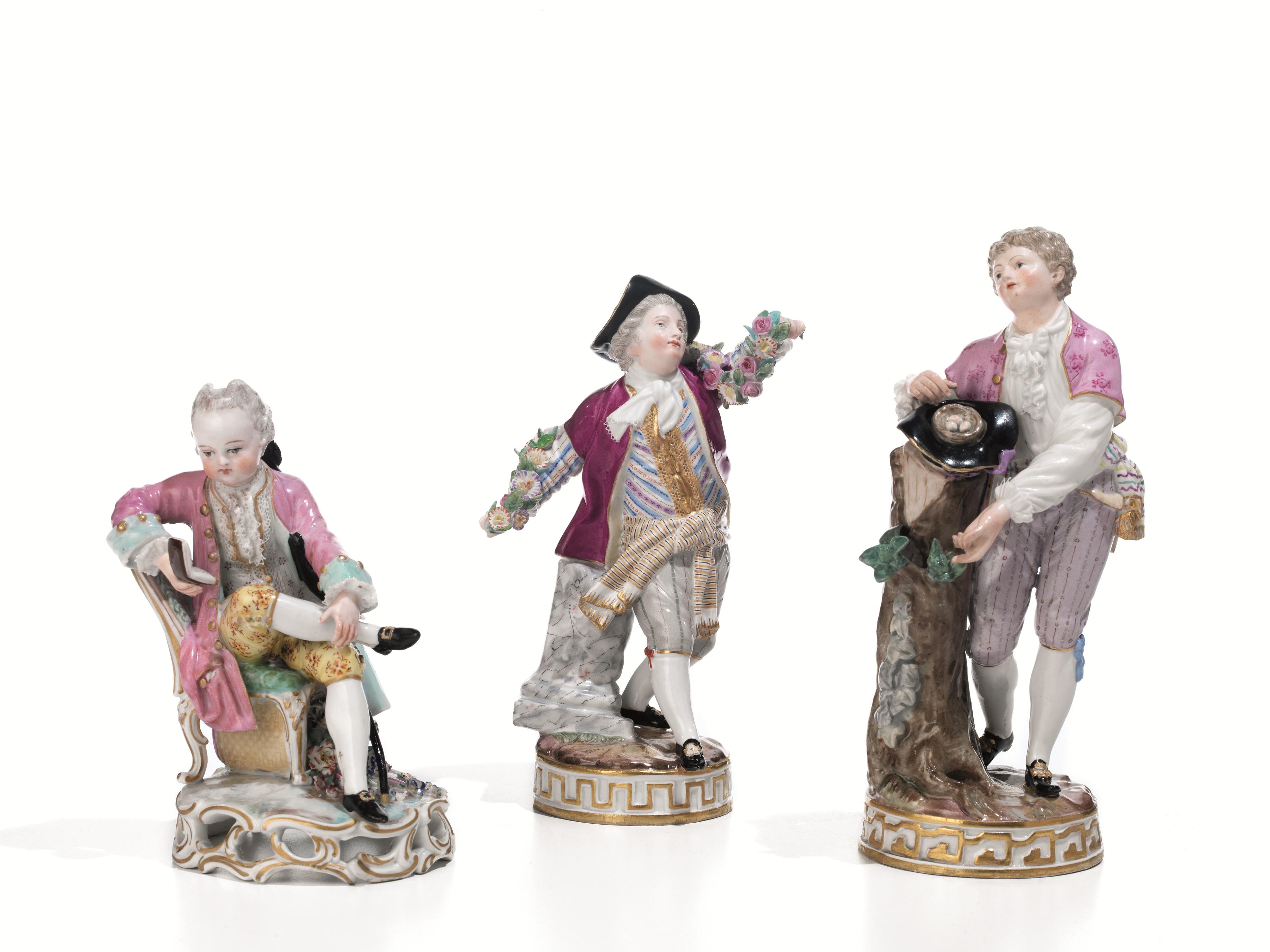 in porcellana policroma modellate rispettivamente a gentiluomo con ghirlanda di fiori, gentiluomo che legge e gentiluomo con nido nel cappello, alt. cm 16; 13 e 18 (3)