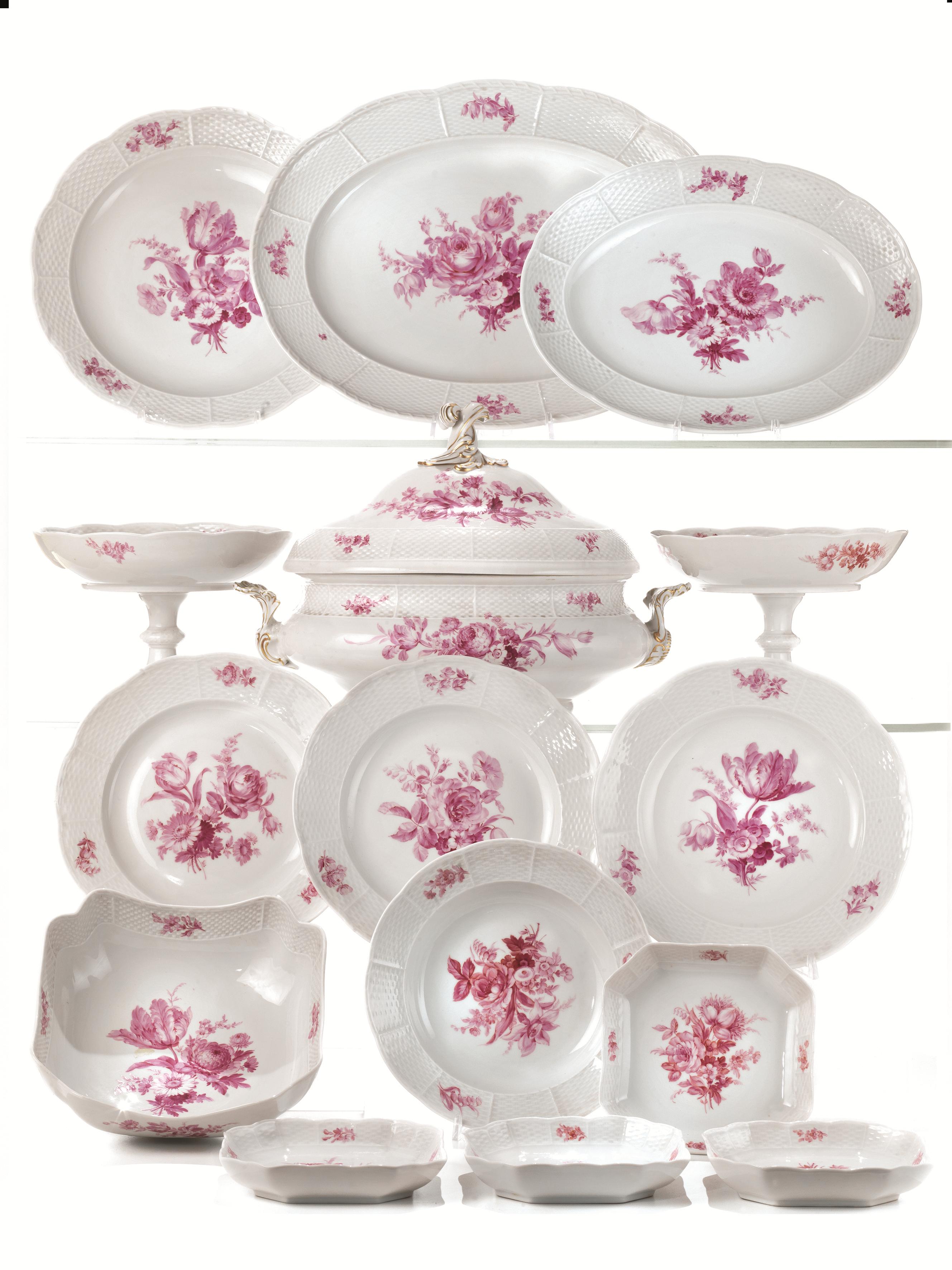 in porcellana bianca decorata con fiori in rosa, composto di centoventuno pezzi (121)