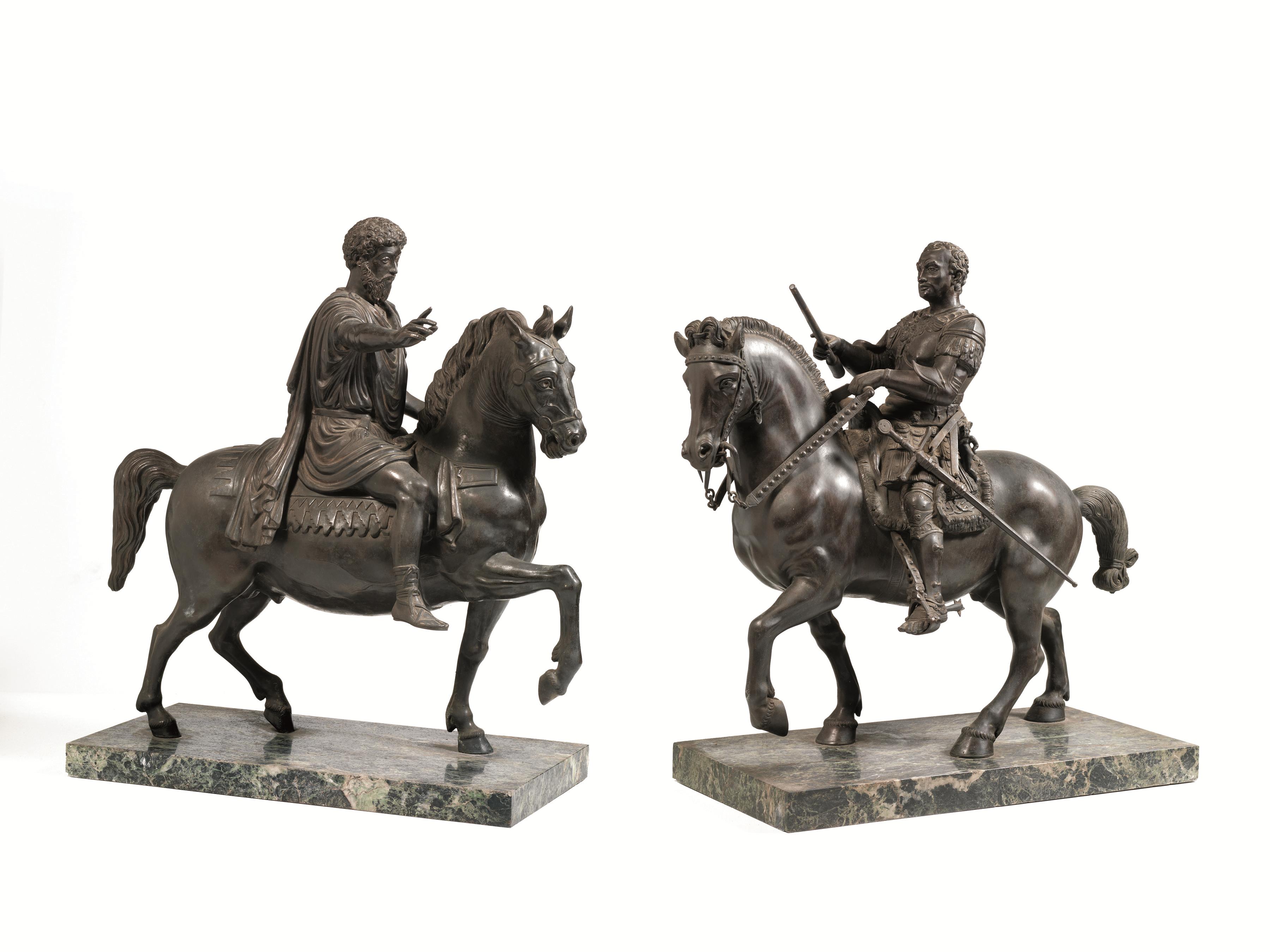 raffiguranti rispettivamente il monumento a Marco Aurelio in Campidoglio e il monumento al Gattamelata di Donatello, su basi in marmo, alt. cm 63 e cm 61, cm 64x34 (2)