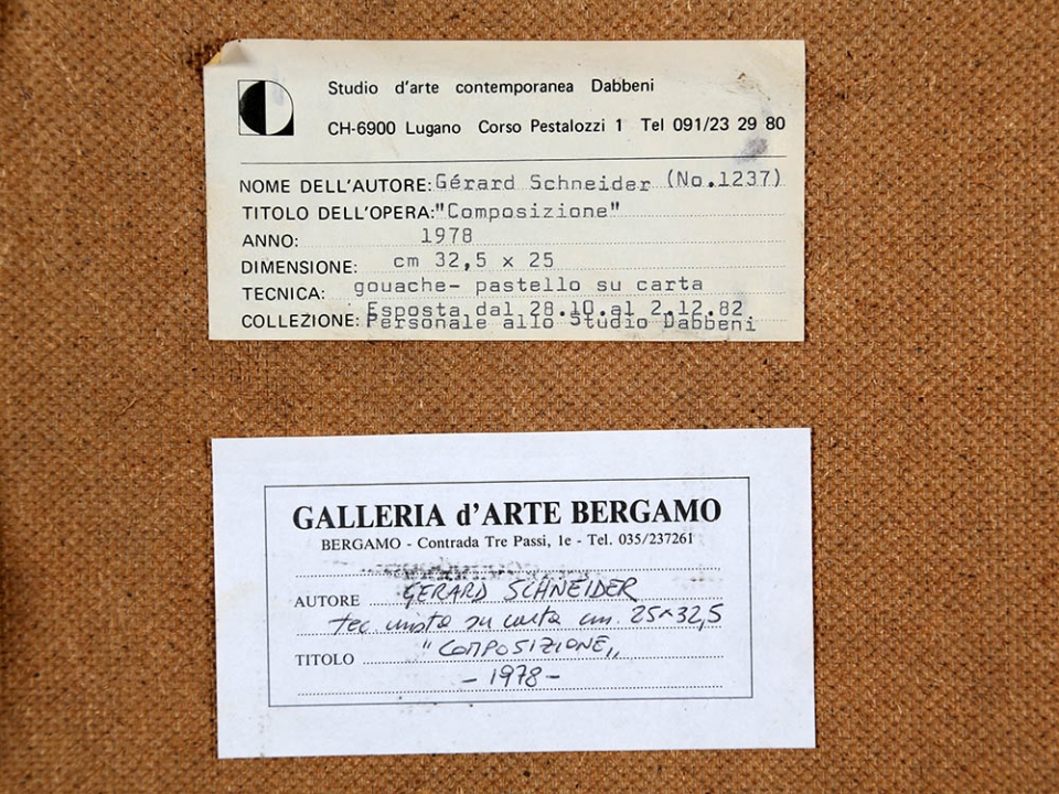 GERARD SCHNEIDER 1896 - 1986 " Composizione ", 1978 Gouache su carta, cm. 25 x 32,5 Firmato e datato in basso a sinistra Etichetta Studio d'Arte Contemporanea Dabbeni Lugano sul retro Etichetta Galleria d'Arte Bergamo sul retro ESPOSIZIONI: " Gérard Schneider ", Studio Dabbeni Lugano, 1982 Prov. Collezione Privata
