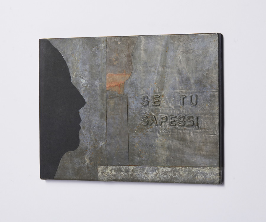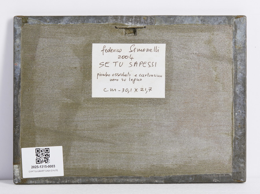 SIMONELLI FEDERICO (n. 1944) SE TU SAPESSI. 2004. piombo ossidato e cartoncino nero su legno. Cm 30,10 x 21,70. titolo