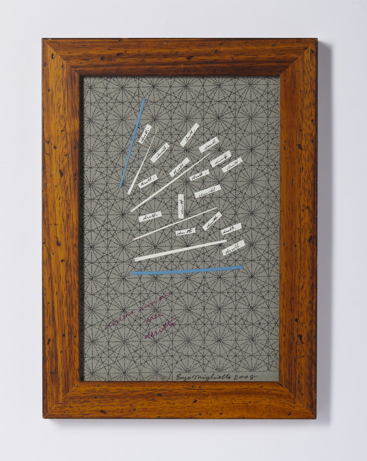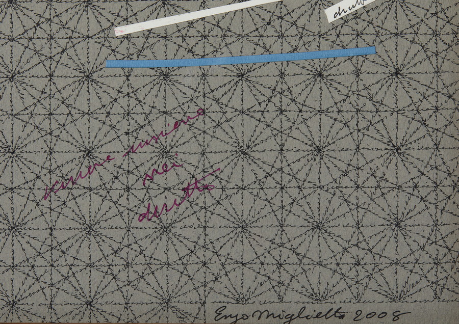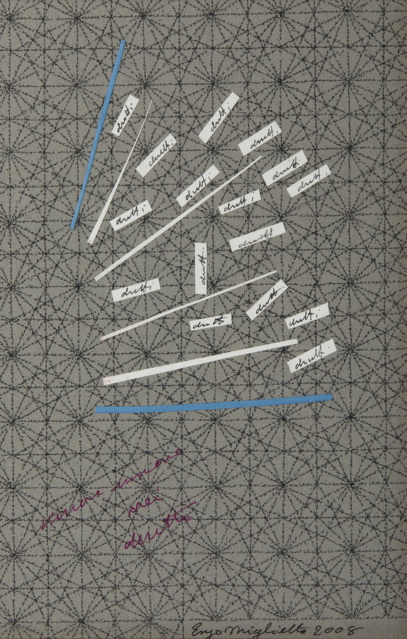 MIGLIETTA ENZO (n. 1928) VIVERE INSIEME NEL DIFETTO. 2008. tecnica mista e collage su carta. Cm 20,00 x 29,50. firma, data e titolo.