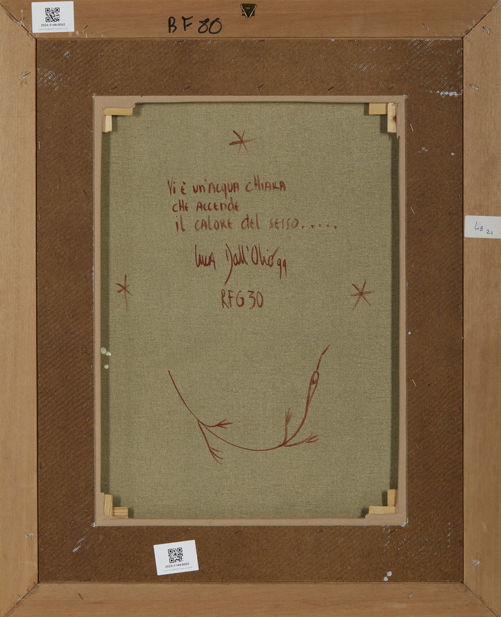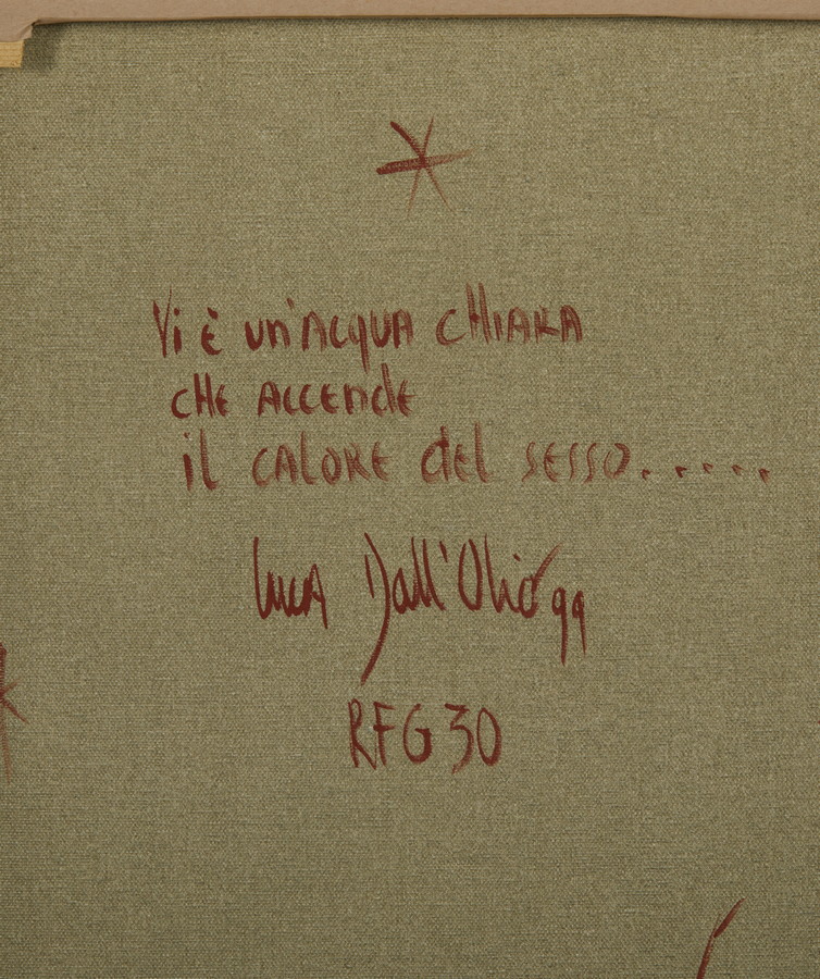 DALL'OLIO LUCA (n. 1958) VI E' UN'ACQUA CHIARA CHE ACCENDE IL CALORE DEL SESSO. 1999. Olio su tela. Cm 45,50 x 60,00. firma