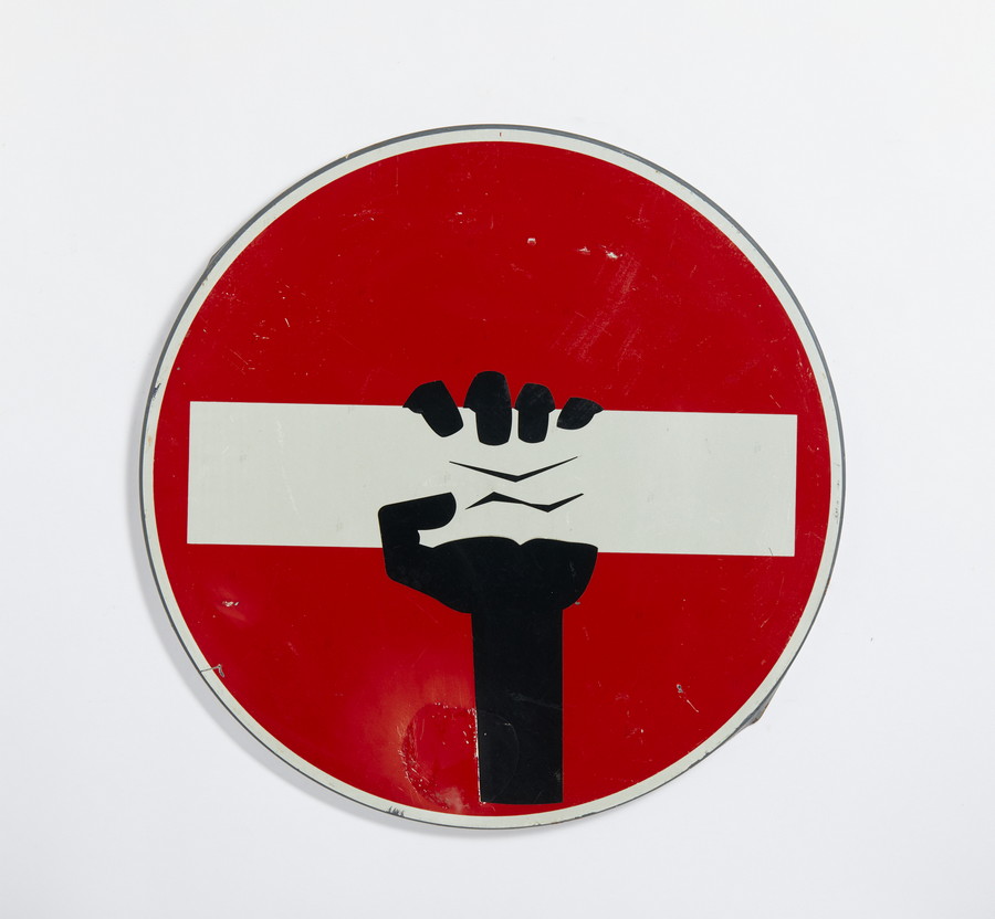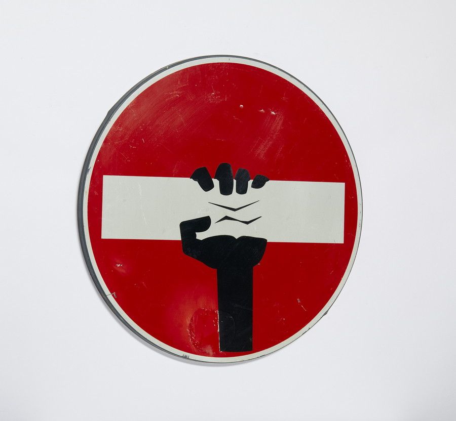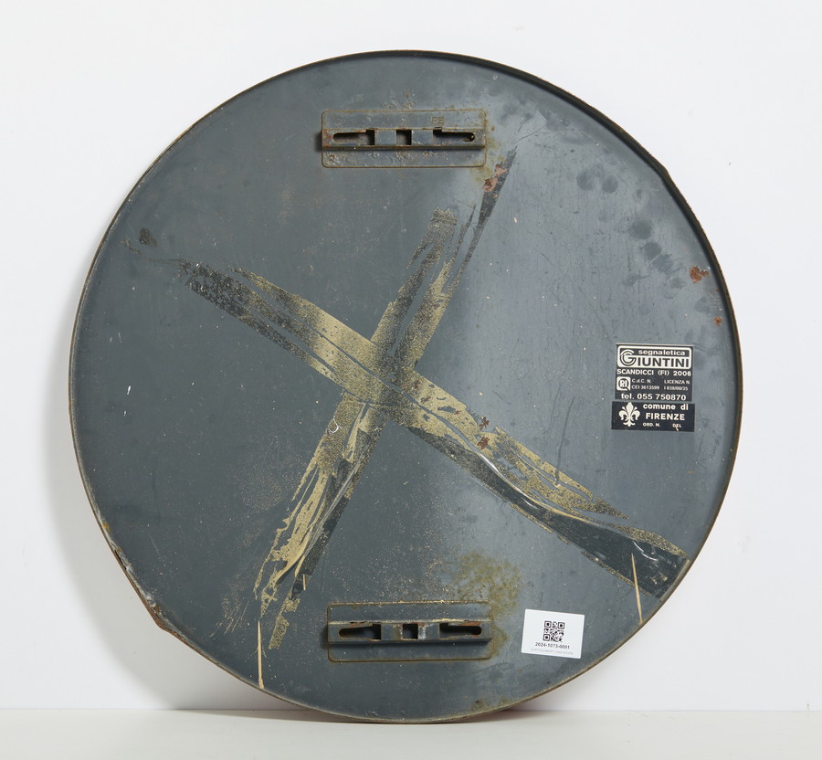 AUTORE NON IDENTIFICATO SENZA TITOLO. Cartello stradale e stickers. Cm 60,00 x 60,00.