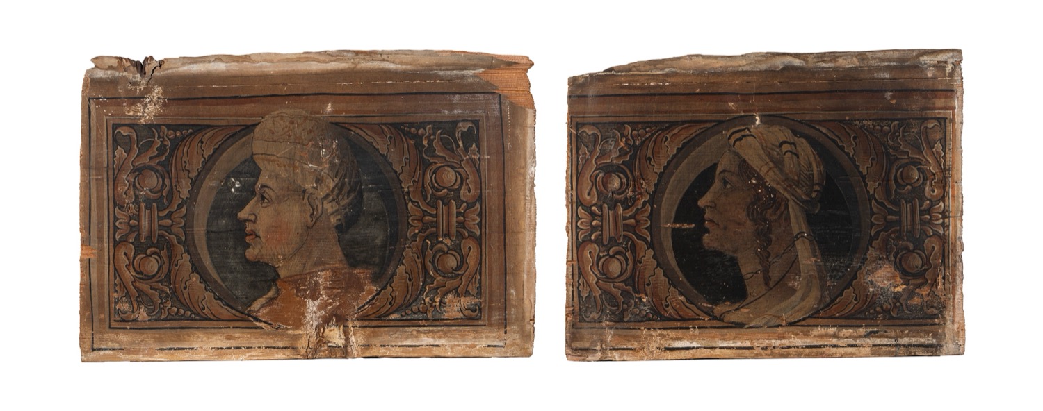 Scuola lombarda, secolo XVI ( ) - Due tavelle da soffitto con profilo maschile e profilo femminile,