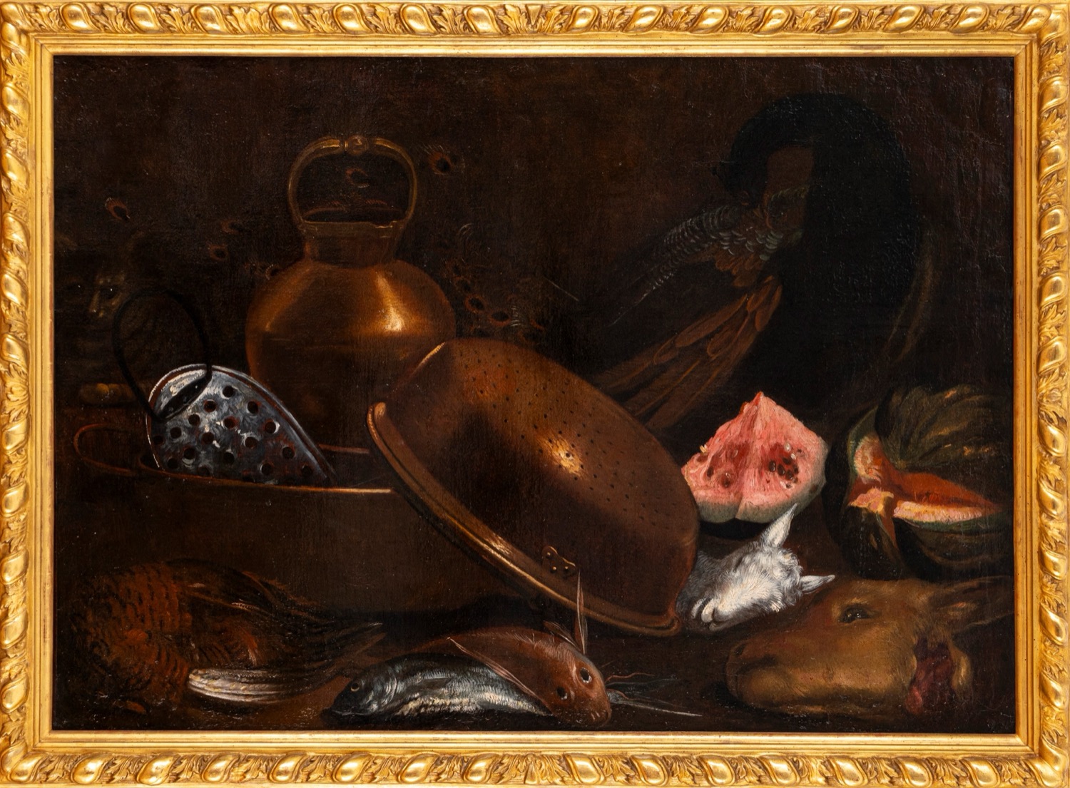 Giovanni Battista Recco (Napoli 1615 - 1660) - Interno di cucina con vasellame, pesci, anguria, gatto e pavone,