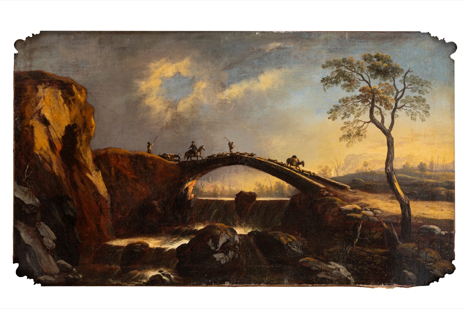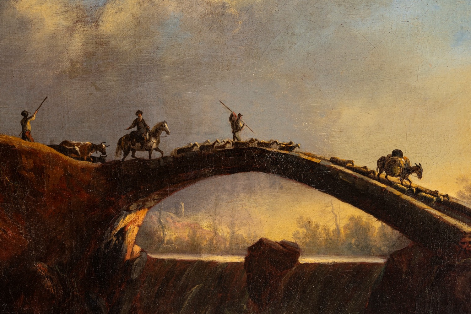 Hans De Jode ( ) - Paesaggio con ponte di pietra e viandanti,