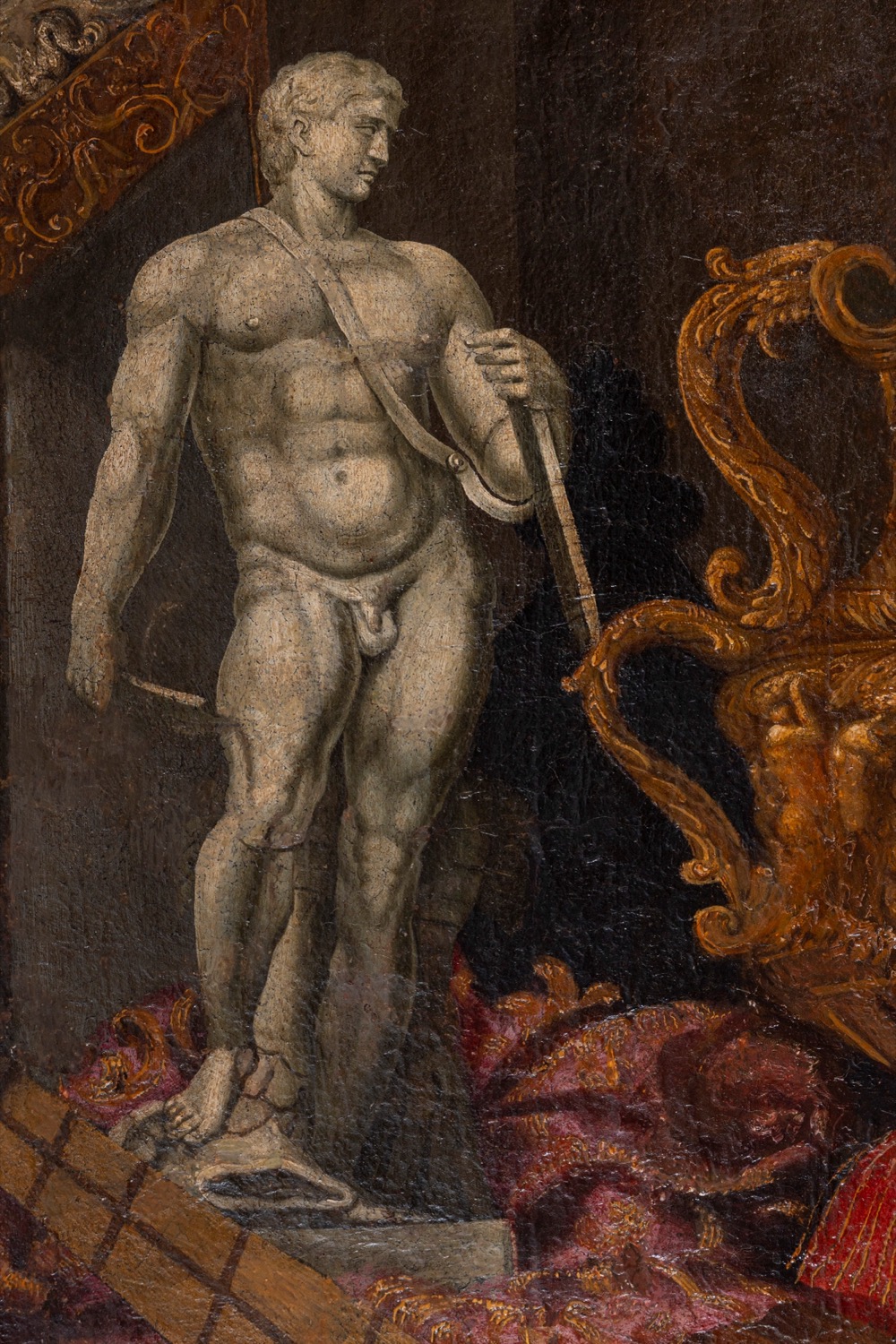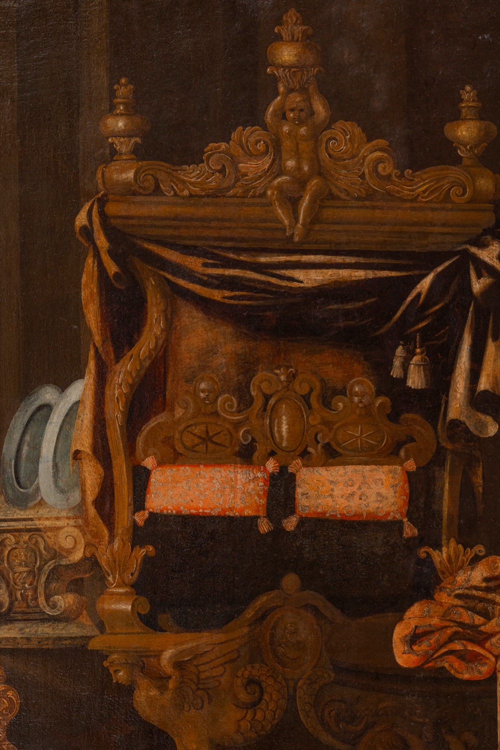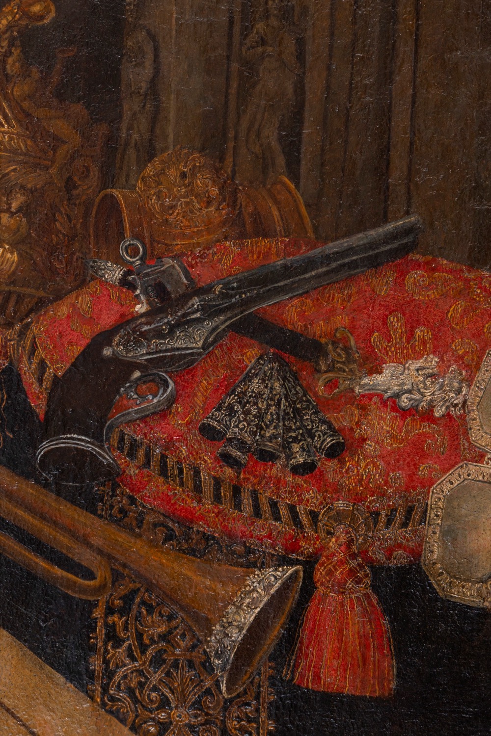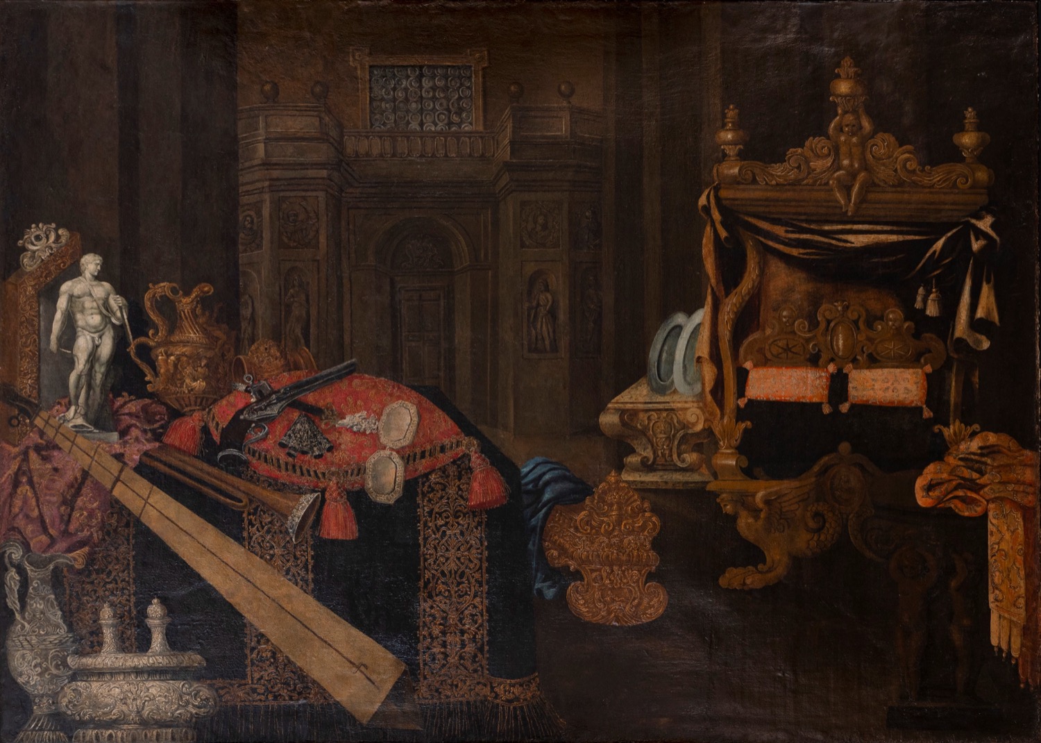 Carlo Manieri (attivo a Roma 1662 - 1700) ( ) - Natura morta con statua, armi e strumenti musicali in un interno con letto a baldacchino,
