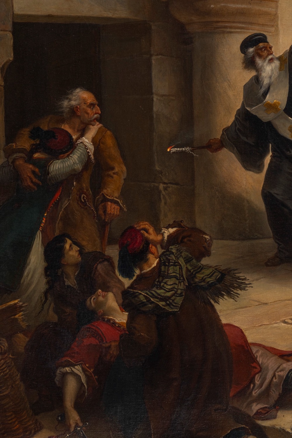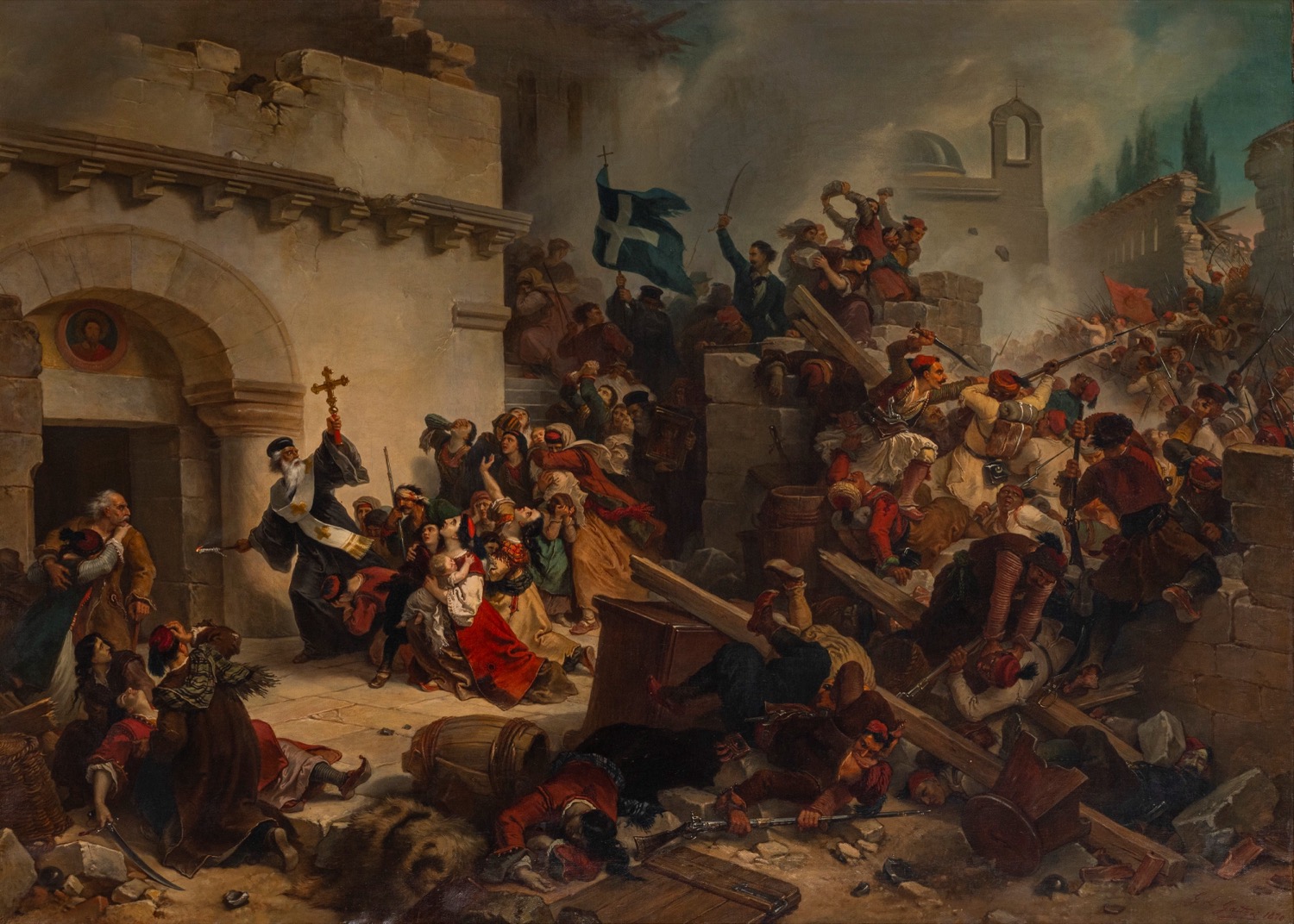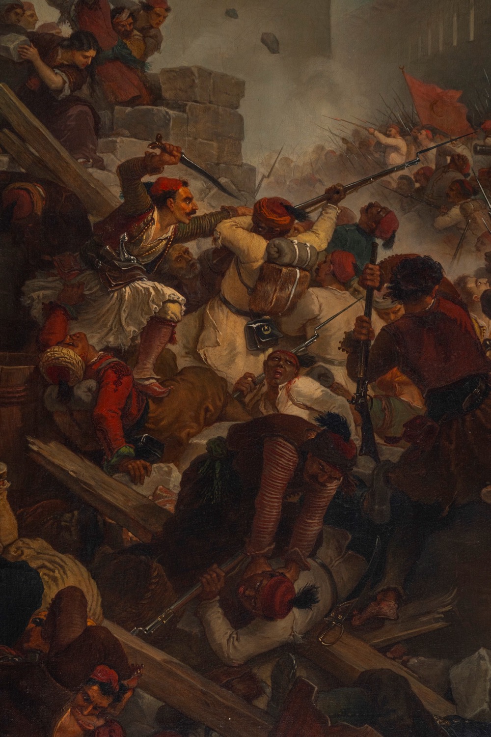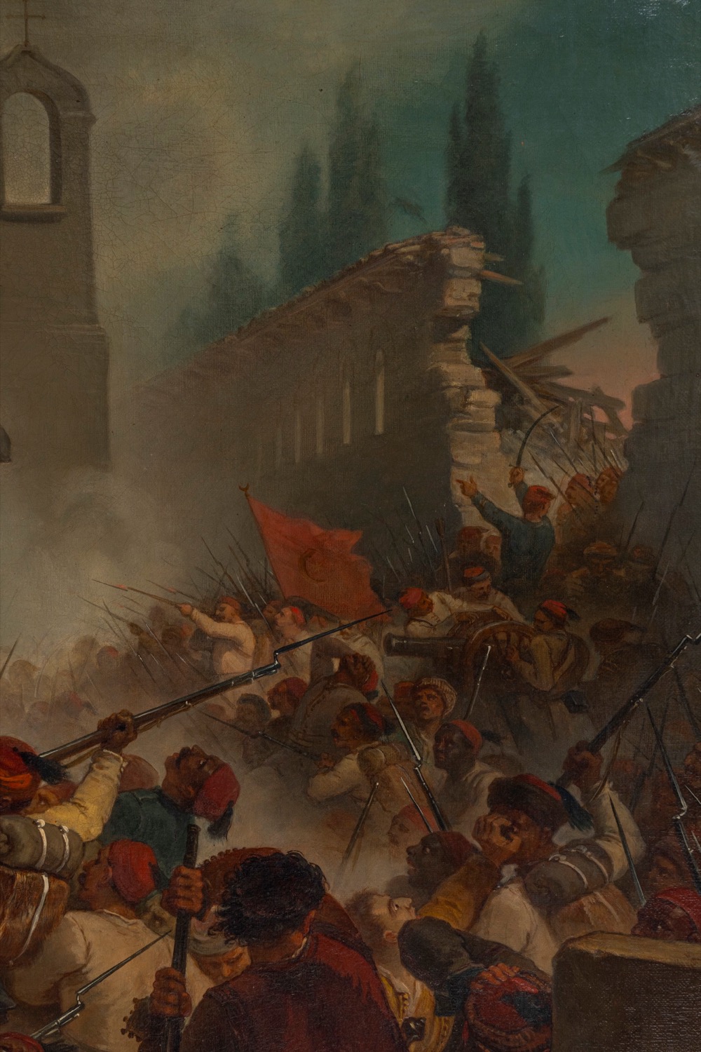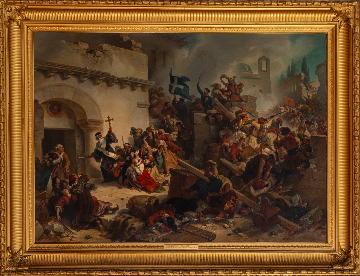 Giuseppe Lorenzo Gatteri si cimenta in questa tela di dimensioni importanti in una concitata raffigurazione di un episodio della guerra d’indipendenza greca. La composizione asimmetrica accentua il moto centripeto, animando il solido sfondo di quinte architettoniche. L’attenzione del riguardante si divide su due elementi paralleli: la croce d’oro sollevata dall’ecclesiastico a sinistra e la bandiera greca orgogliosamente sventolata da un altro prete al centro. A questo patriottismo civile e religioso si affianca quello più fieramente militaresco del combattente che, vestito dello stesso blu della bandiera, incita i rivoltosi sollevando una spada. Sul fronte opposto, le truppe turche, riconoscibili dai fez rossi e dalla bandiera con la mezzaluna, irrompono da una breccia sulla destra. Il fumo dei cannoni e dei moschetti pervade suggestivamente la scena e spiega i corpi esanimi riversi a terra in primo piano: siamo nel secondo momento di un assalto iniziato con un bombardamento che ha già impietosamente mietuto vittime civili. Lo spettatore è così trascinato nel mezzo dell’azione, nel presagio della sua sanguinosa conclusione.