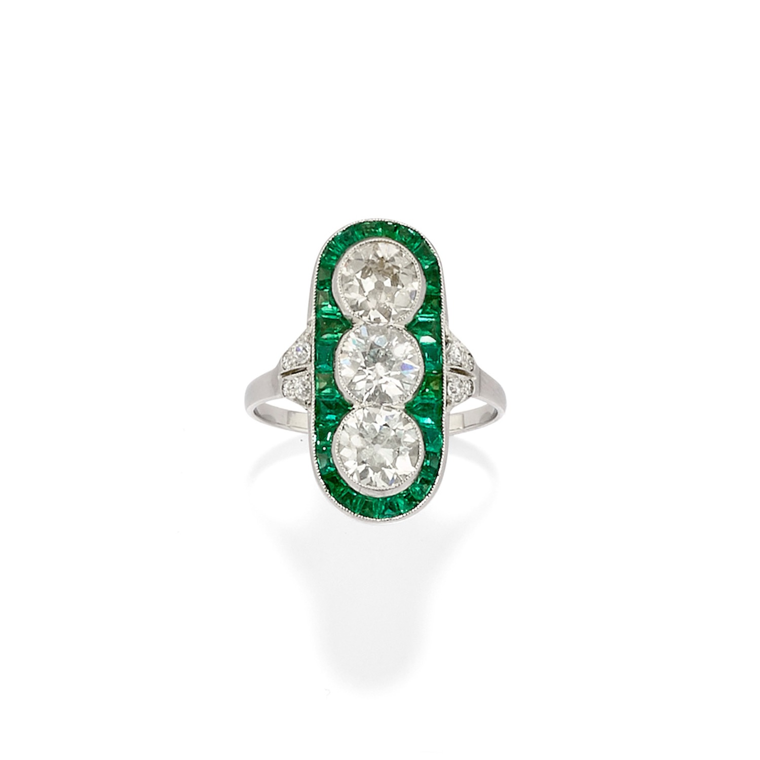 Lotto 55 | Anello con diamanti e smeraldi in oro bianco 18k