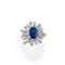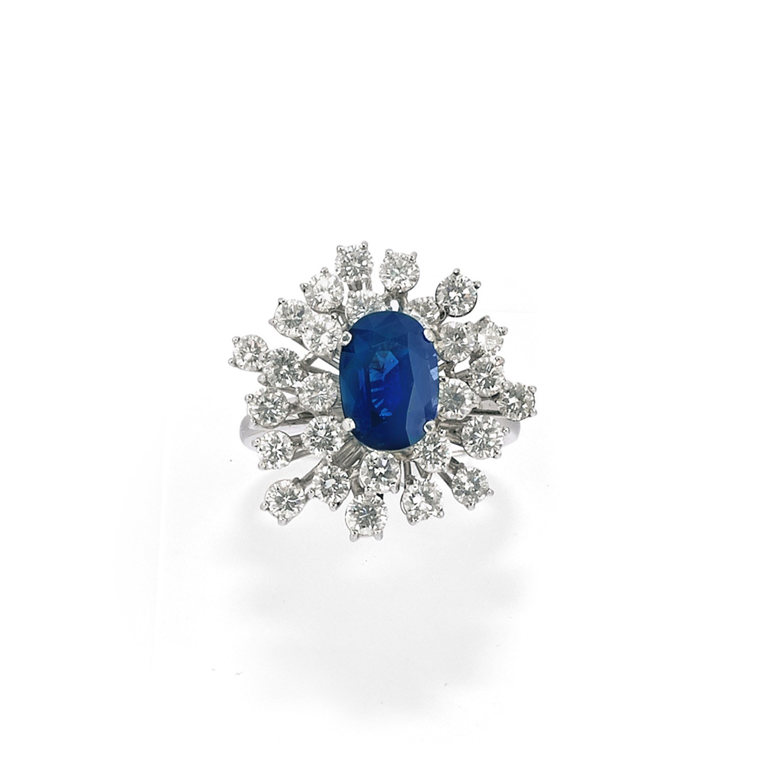 con zaffiro taglio ovale di ct 2,00 circa con motivo a griffes in diamanti taglio brillante per totale ct 1,50 circa.
