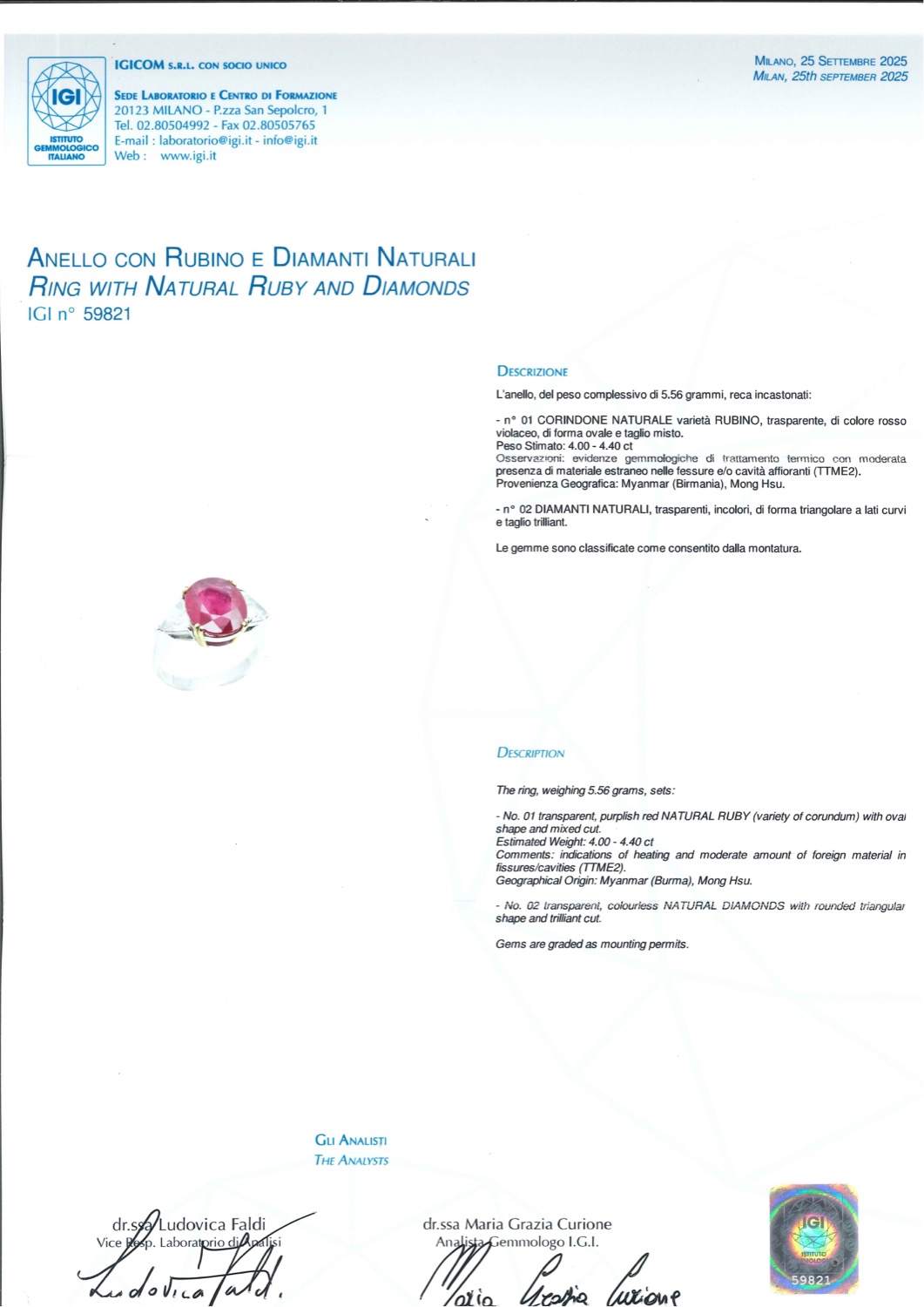 Il rubino è accompagnato da certificato gemmologico n. 59821 del 25/09/2025, IGI Milano.