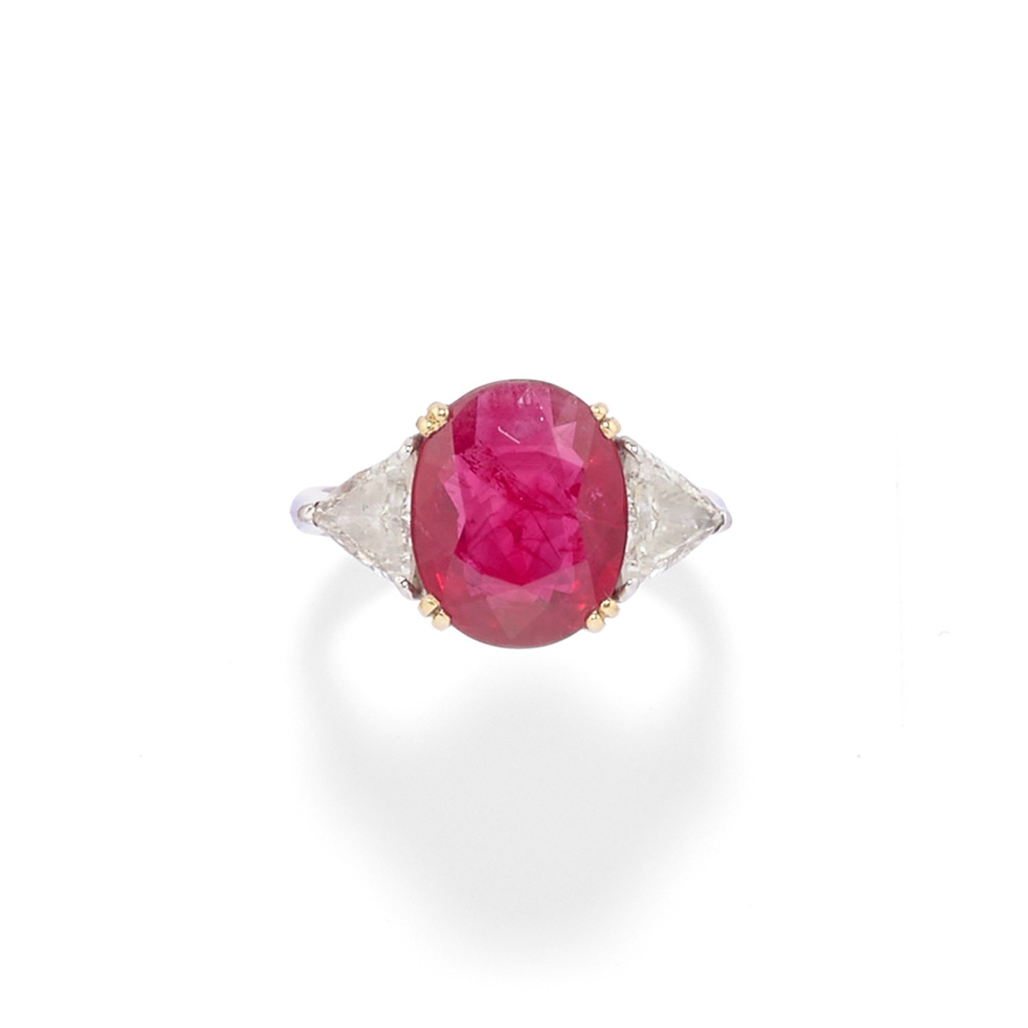 al centro rubino Burma di ct 4/4,40 circa, heat, con ai lati due diamanti taglio trilliant per totale ct 1,00 circa.