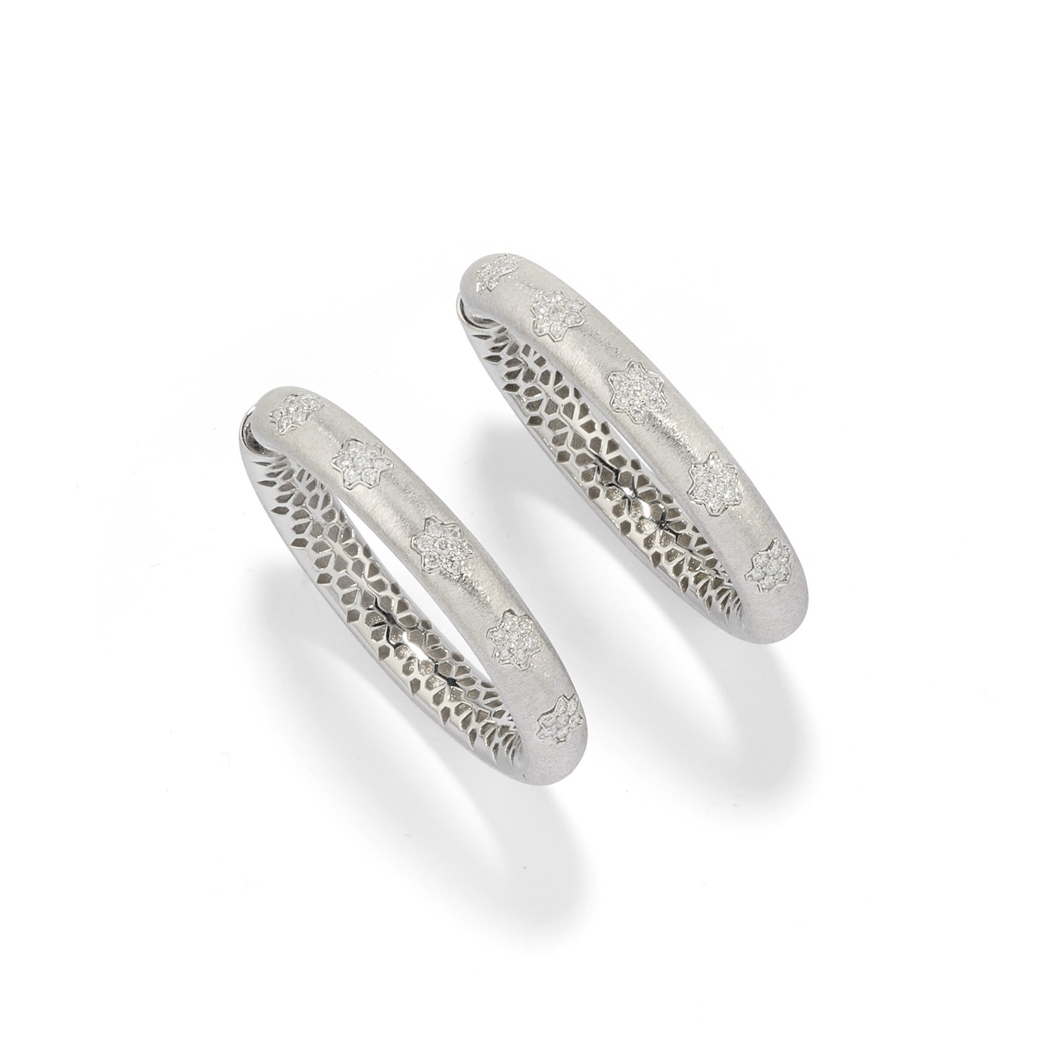 a cerchio, satinati, con motivo a fiore in diamanti taglio brillante per totale ct 0,60 circa, chiusura a perno con scatto.