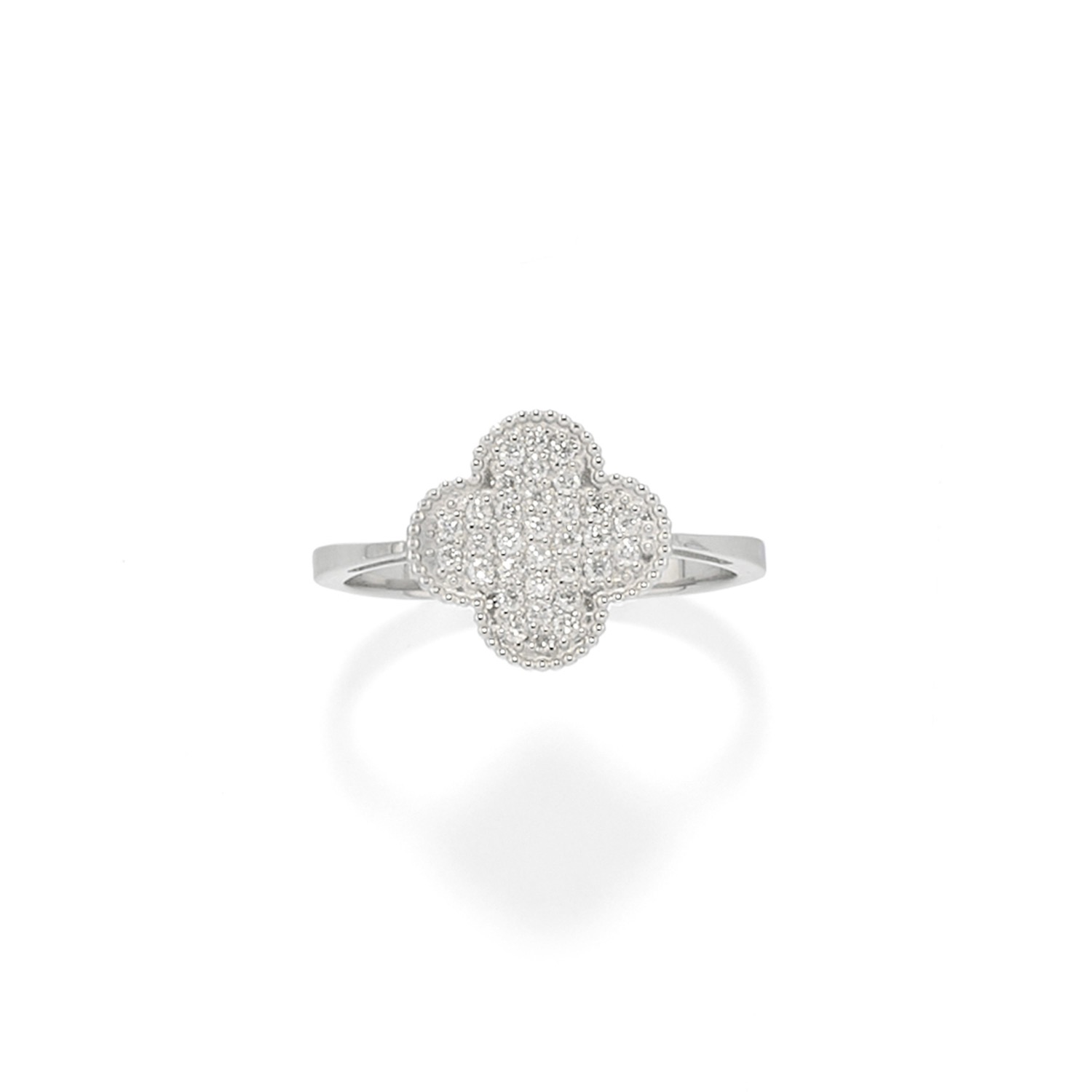 disegno a quadrifoglio, decorato da diamanti taglio brillante per totale ct 0,15 circa.