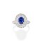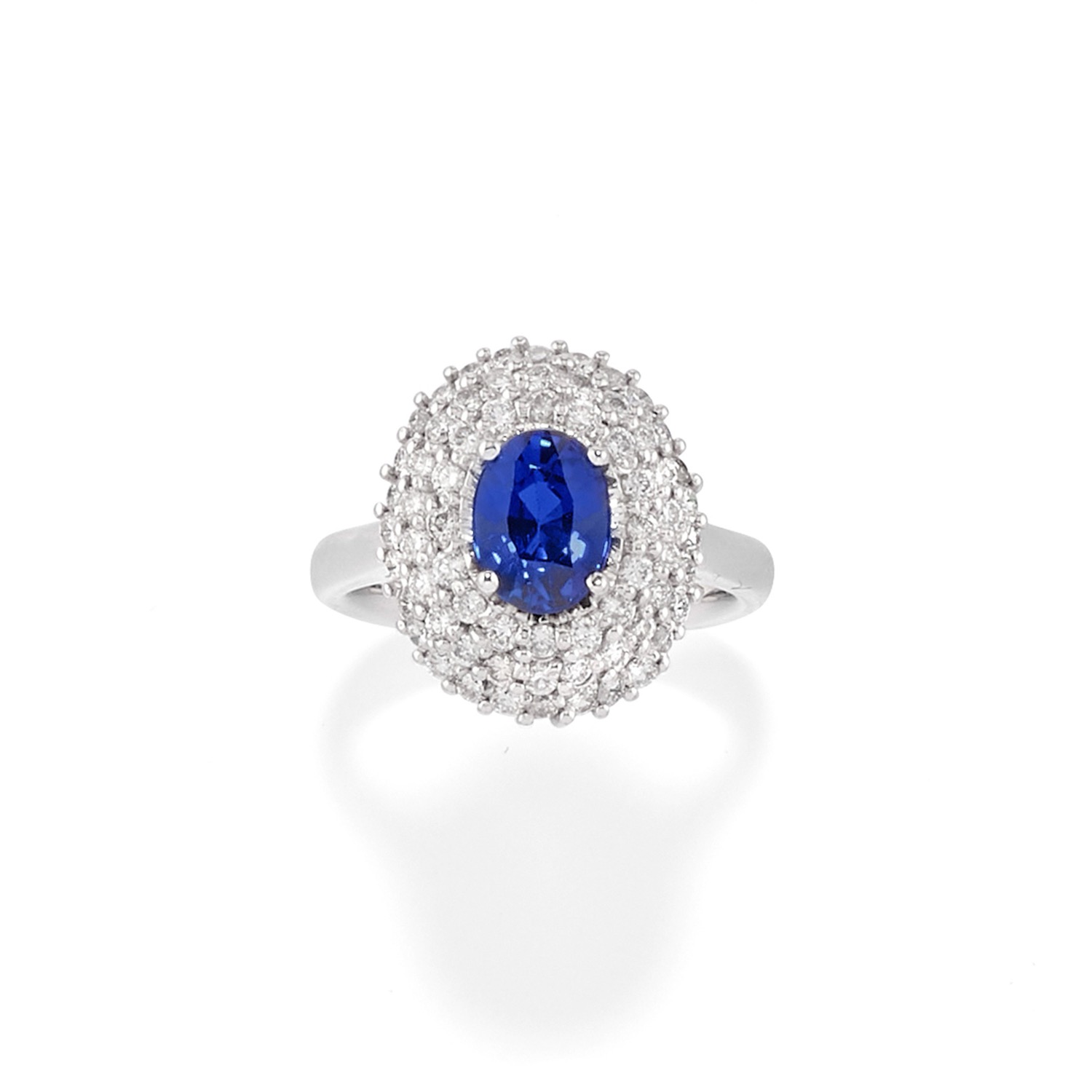 con zaffiro taglio ovale di ct 2,20 circa entro contorno in diamanti taglio brillante per totale ct 1,30 circa.
