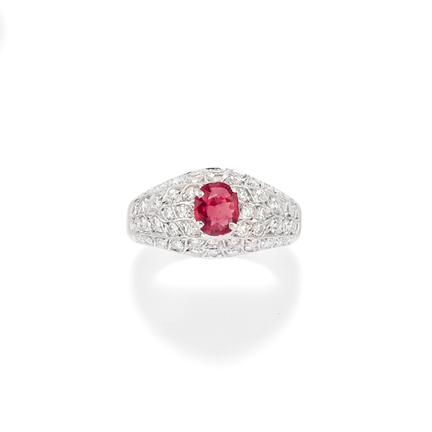 con rubino taglio ovale di ct 0,50 circa e diamanti taglio huit-huit a decoro.