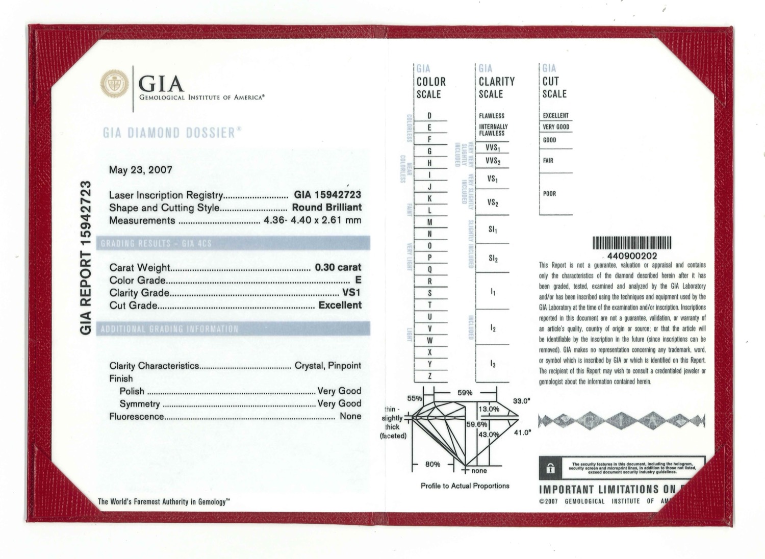 al centro diamante taglio brillante di ct 0,30 (colore E purezza VS1) e quattro diamanti taglio brillante a decoro, con scatola, dustbag, sacchetto e certificato.