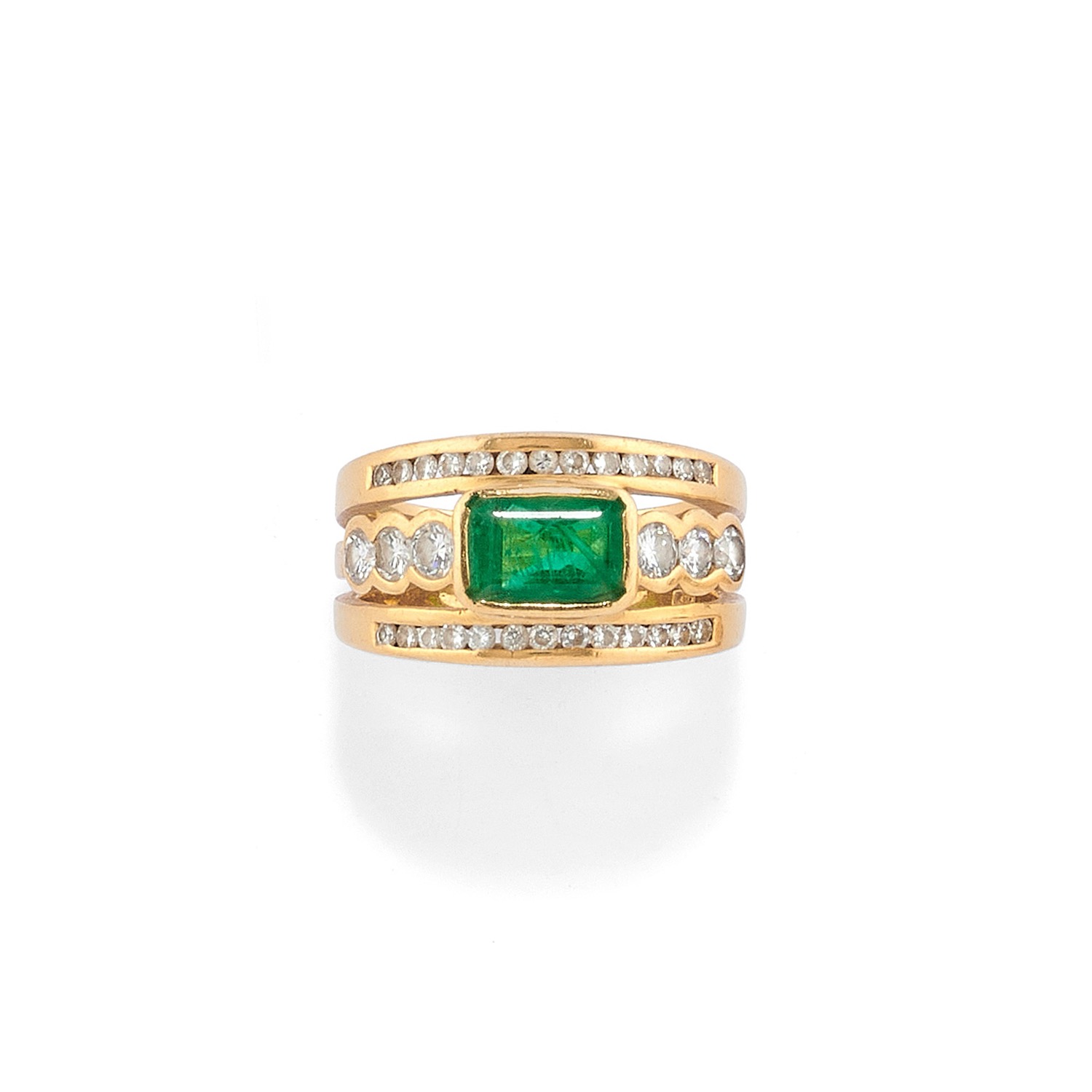 a fascia, con al centro smeraldo taglio rettangolare a contorno ottagonale di ct 1,00 circa e diamanti taglio brillante.