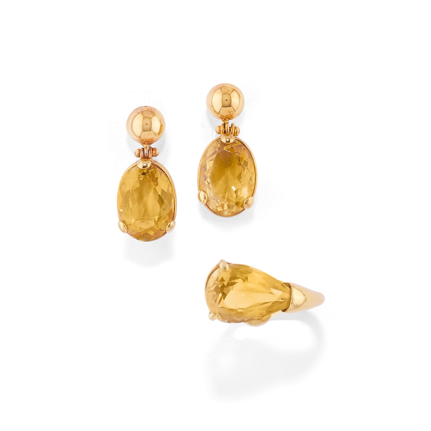 composta da anello con quarzo taglio goccia e coppia di orecchini con quarzi taglio ovale, con chiusura perno e farfalla.