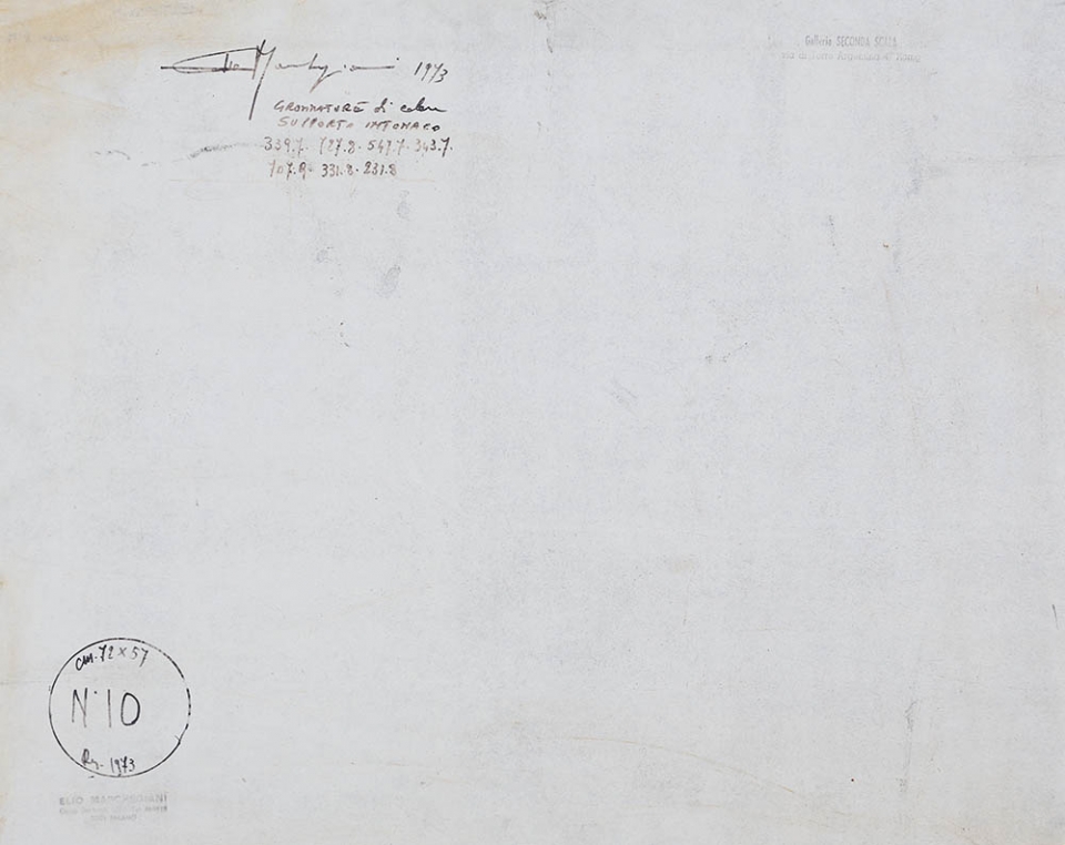 ELIO MARCHEGIANI 1929 " Grammature di colore ", 1973 Pigmenti e intonaco su legno, cm. 52 x 72 Firmato e datato sul retro Timbro dell'artista sul retro Timbro Galleria Seconda Scala Roma sul retro Certificato di autenticità a cura della Galleria Giraldi Prov. Collezione Privata