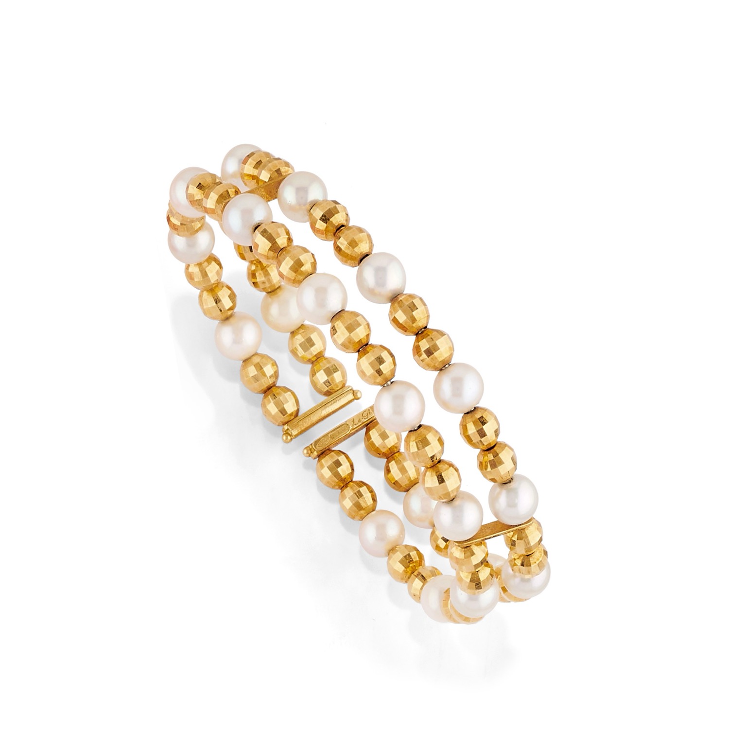 composto da collana ad un filo di perle coltivate di mm 7,00/7,50 circa e bracciale con perle coltivate di mm 6,00 circa alternate a boules sfaccettate in oro, leggermente elasticizzato con lamina all'interno.