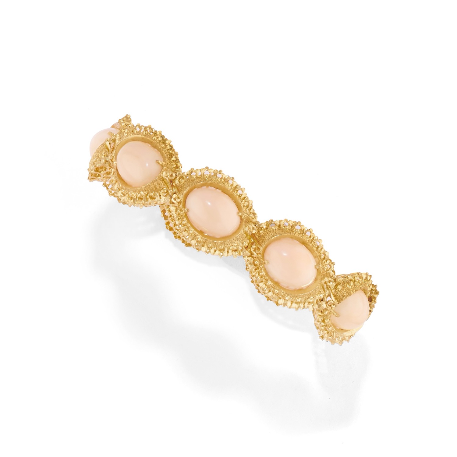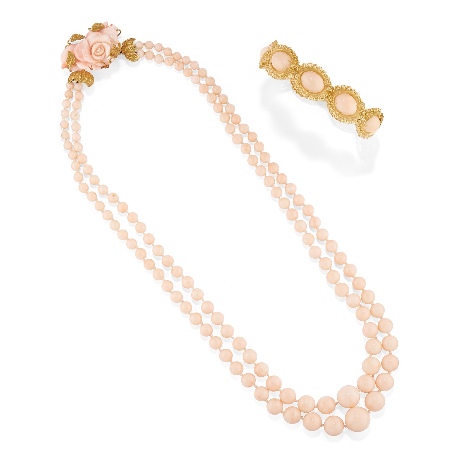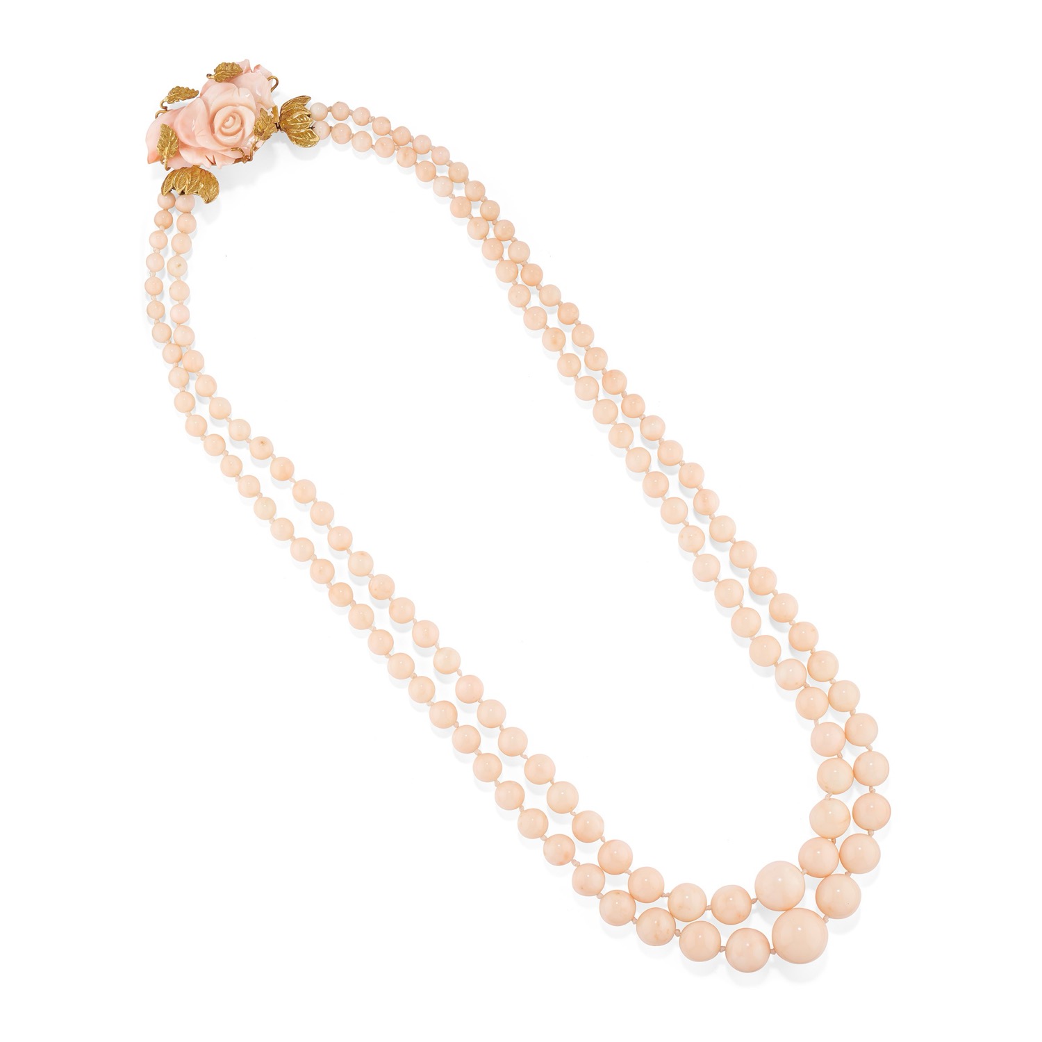 composto da collana a due fili di boules in corallo rosa disposte a degradé dal centro di mm 16,00/5,00 circa con chiusura scolpita a rosa e bracciale con inserti ovali in corallo rosa.