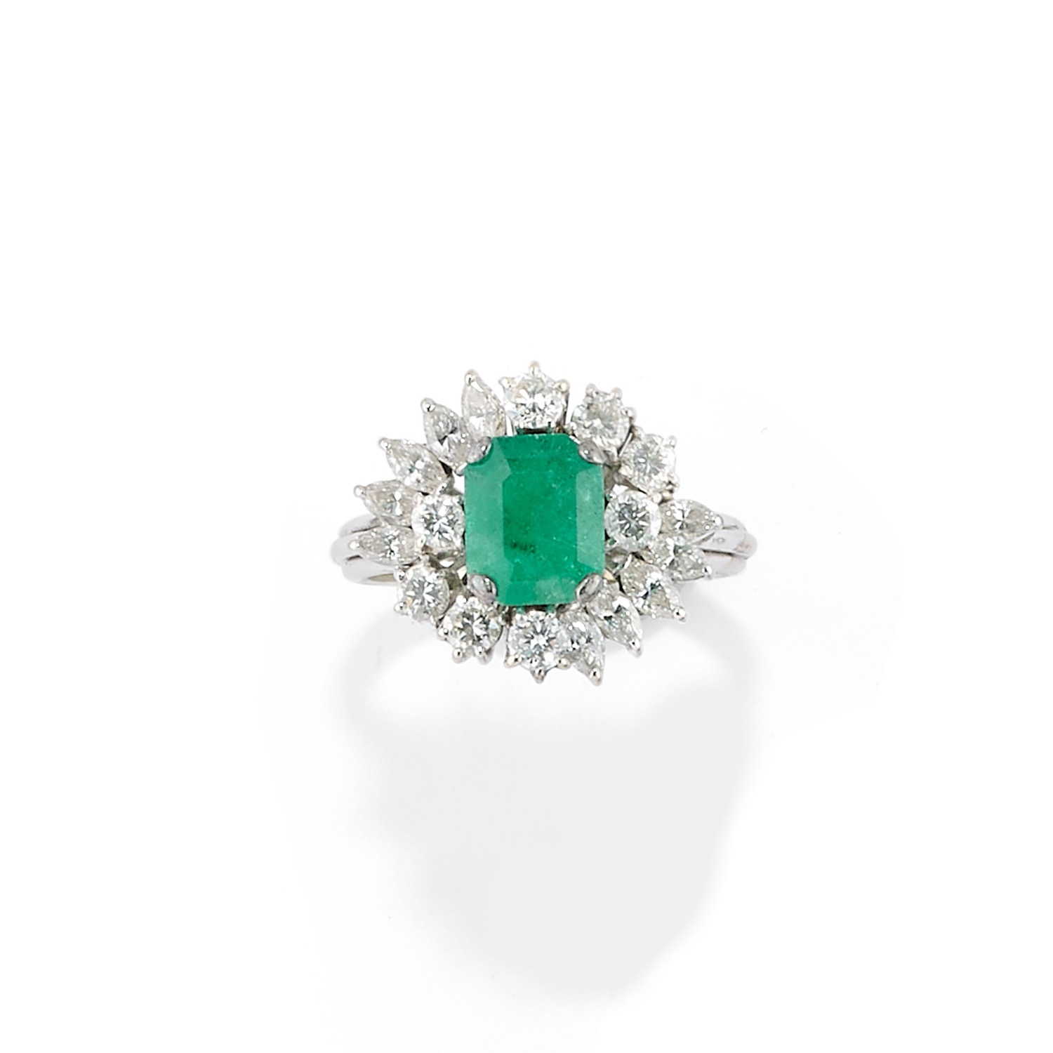 al centro smeraldo taglio rettangolare a contorno ottagonale di ct 1,00 circa, contorno in diamanti taglio brillante e navette.